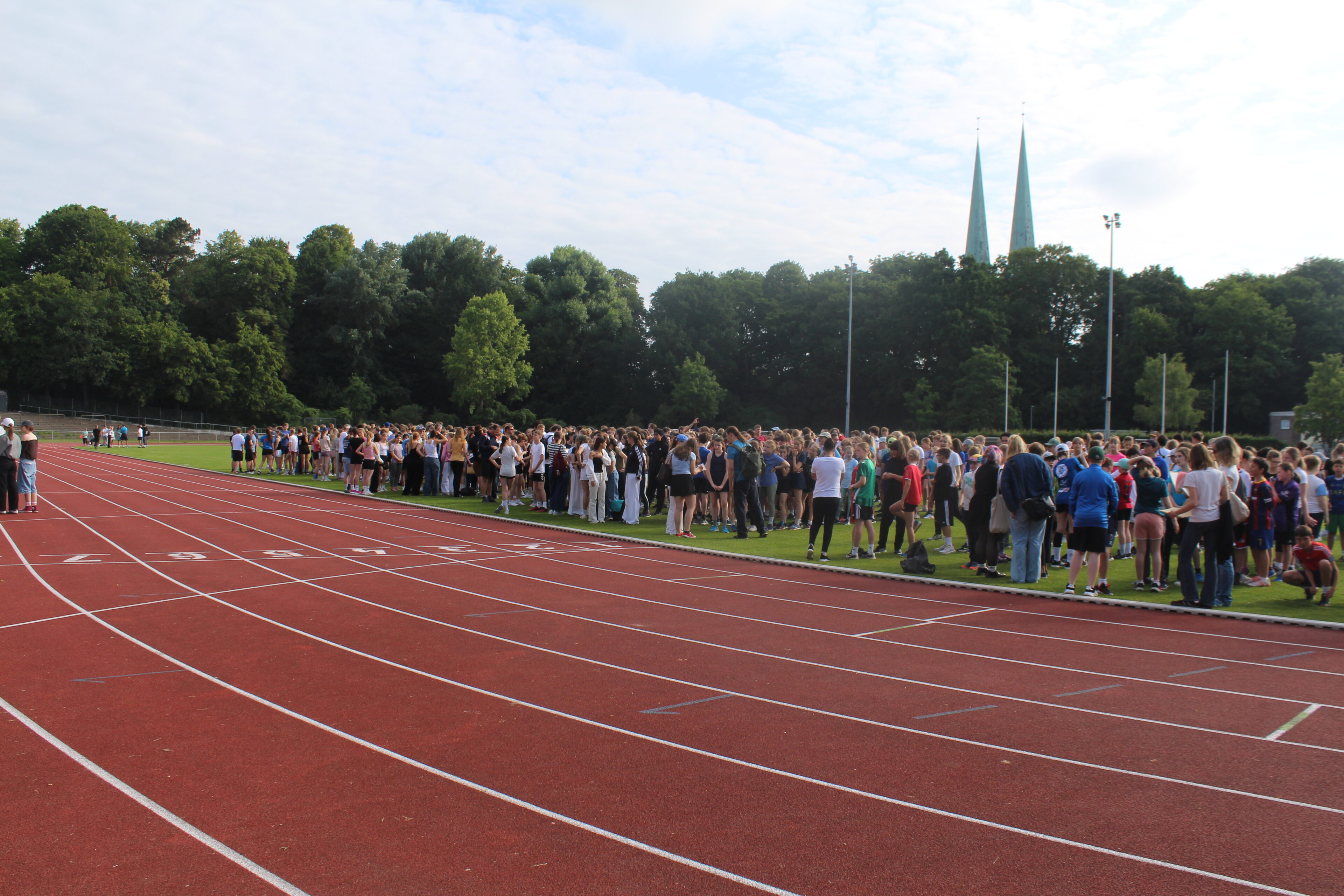 Lübeck, 18. Juni 2025 – angenehme 25 Grad, blauer Himmel, strahlende Sonne: Der Sommer ist da – und wir waren es auch. Während der Unterricht sonst um 8 Uhr im Klassenraum beginnt, versammelte sich das Katharineum am Mittwochmorgen draußen unter freiem Himmel auf dem Buniamshof. Aber nicht nur, um das gute Wetter zu genießen, sondern um richtig Gas zu geben! Denn die Bundesjugendspiele 2025 standen an.