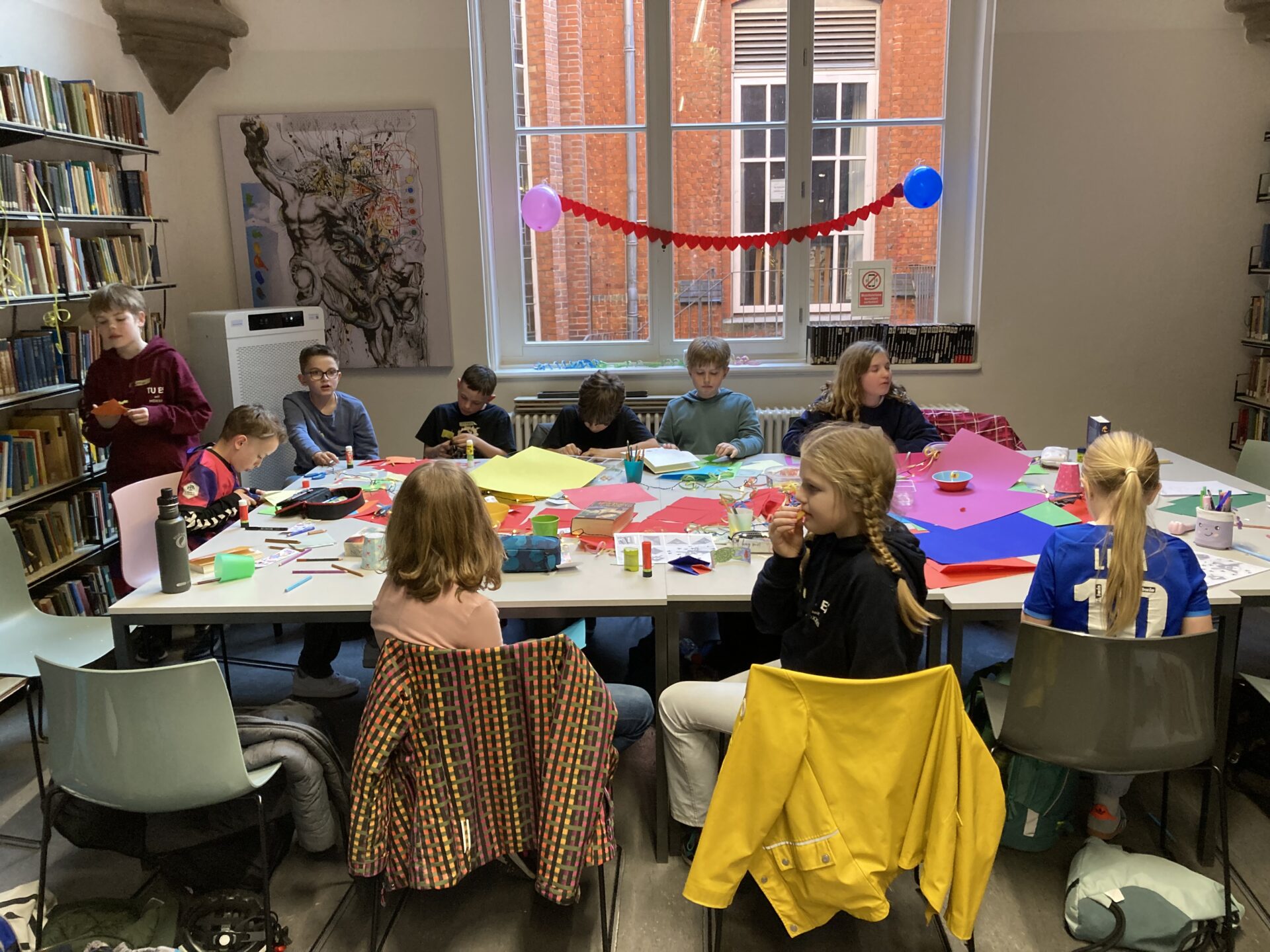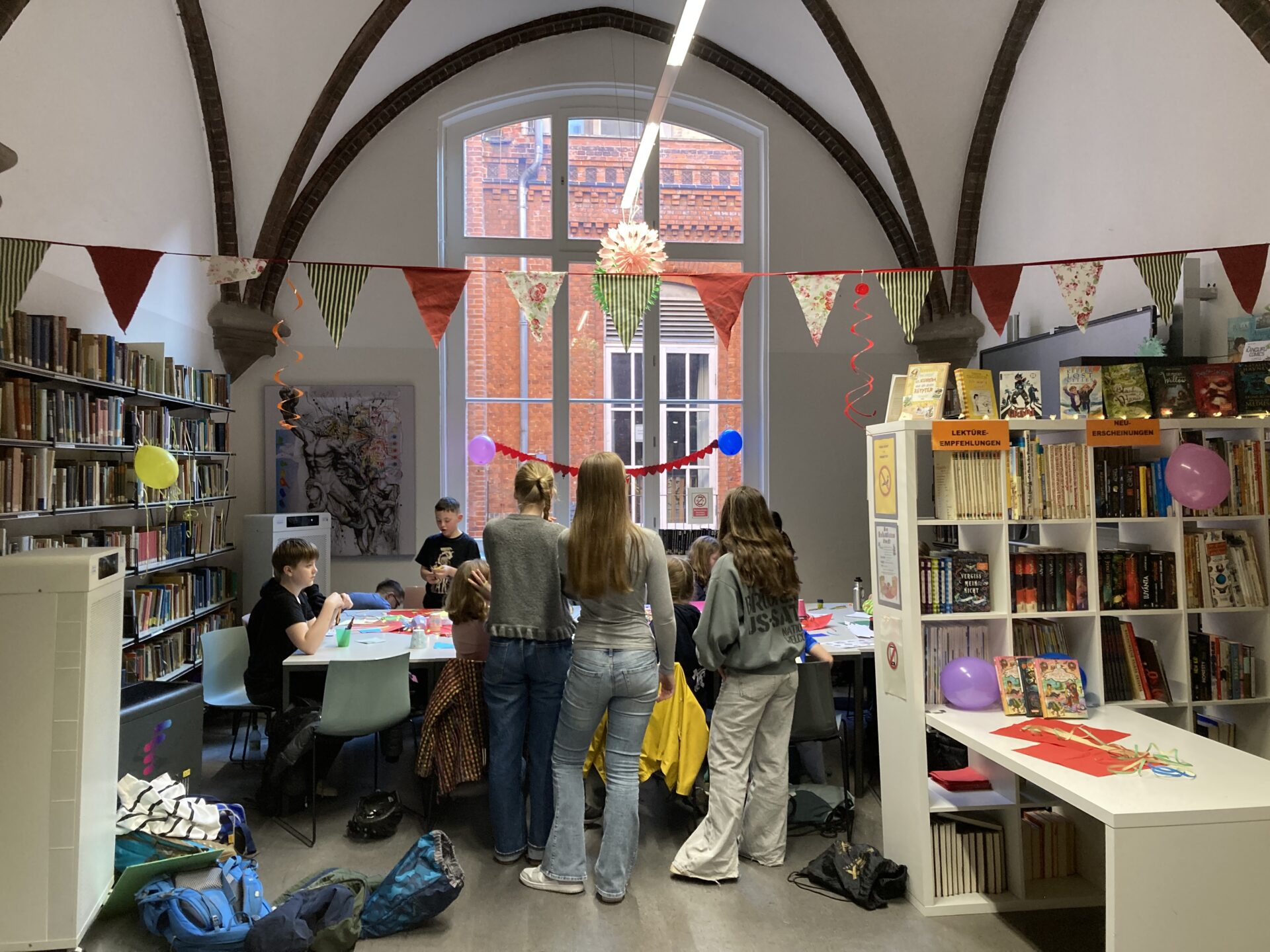 Nach einer kurzen Vorstellungsrunde, bei der alle Teilnehmenden auch ihre Lieblingsbücher präsentieren konnten, ging es dann so richtig los. In gemütlicher Atmosphäre wurde gemeinsam gelesen, gebastelt und draußen auf dem Turnhof gespielt.