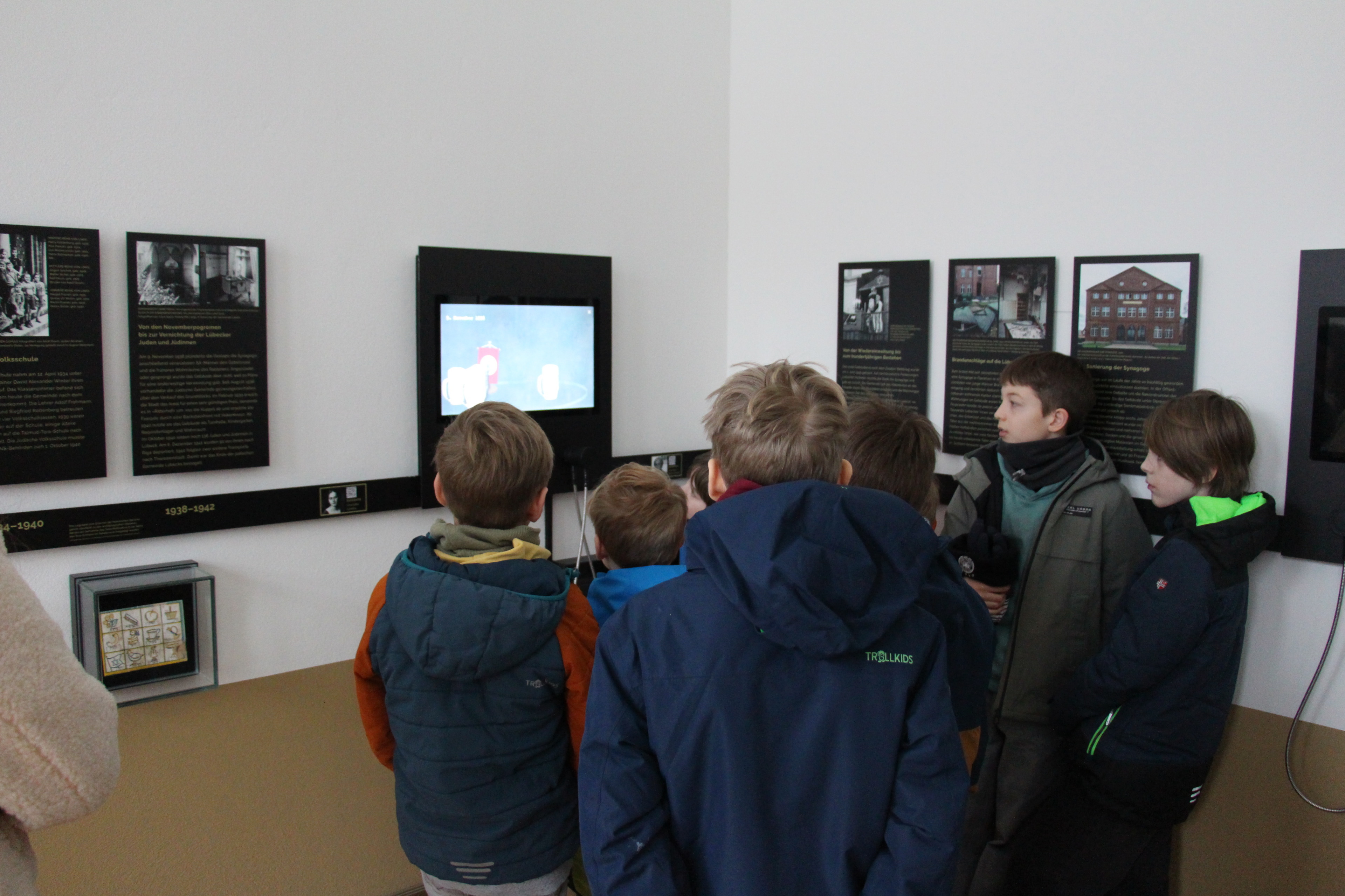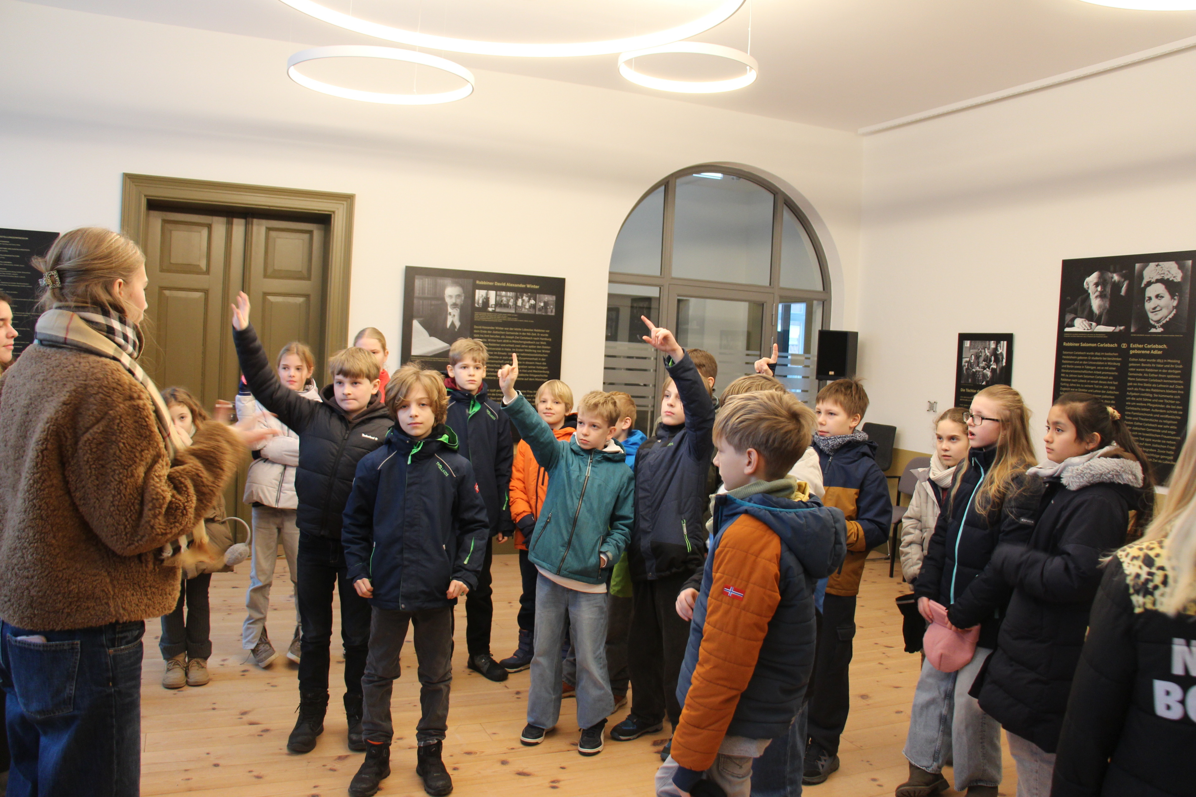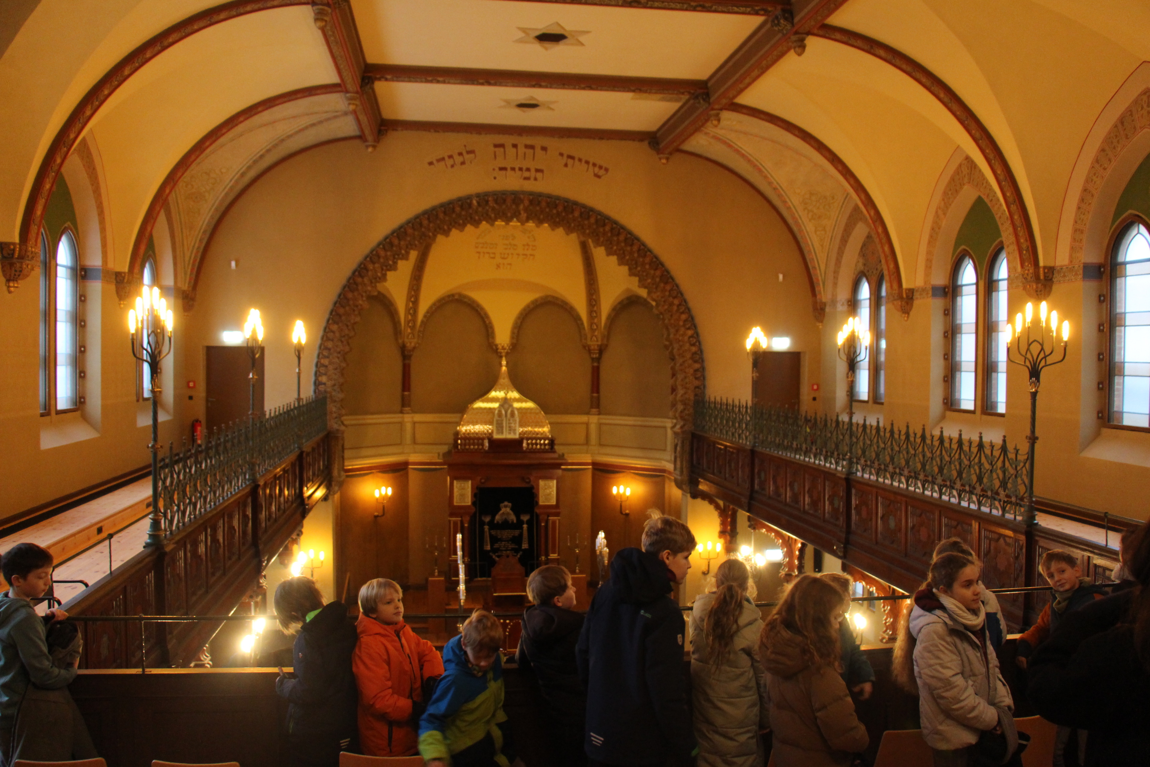 Am Gedenktag führten wir die 5. Klassen durch die Carlebach-Synagoge. Dabei konnten die Schülerinnen und Schüler unter anderem den beeindruckenden Gebetssaal sowie die verschiedenen Ausstellungsräume entdecken. Durch den Religionsunterricht verfügten sie bereits über viel Vorwissen, sodass wir mit ihnen gut über das Judentum und die Geschichte der Synagoge ins Gespräch kommen konnten. Teilweise wurden die Führungen auch von Herrn Kogan, einem Mitglied der jüdischen Gemeinde Lübecks, begleitet. Die Fünftklässler waren stets motiviert und interessiert dabei, weshalb wir die Führungen insgesamt als sehr gelungen empfanden. (Marlene Kitzrow)