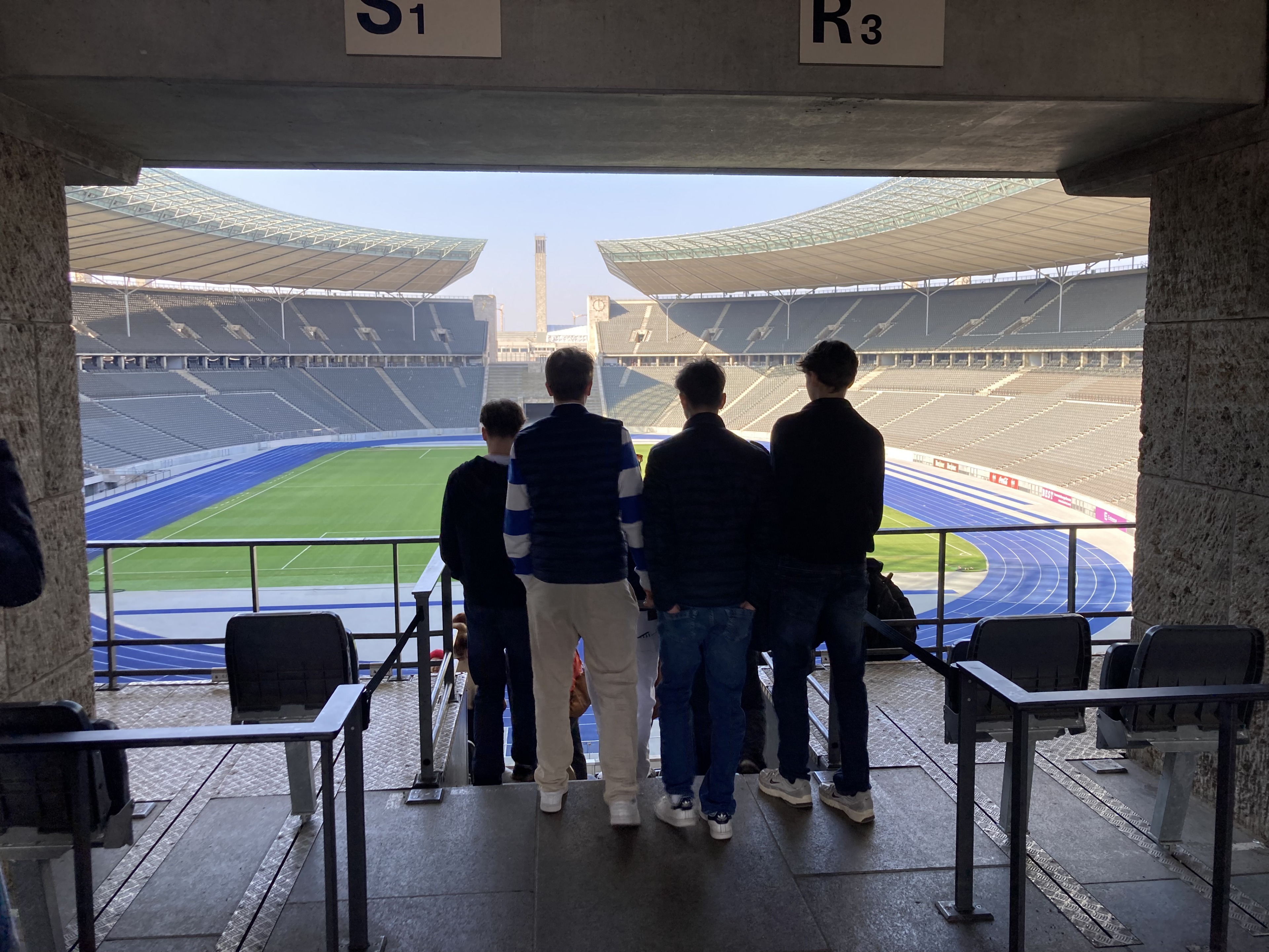 Am Ende der Führung gehen wir noch einmal hinauf auf die Tribüne. Von dort oben wirkt alles ruhig und fast friedlich. Kaum vorstellbar, dass dieser Ort früher für politische Inszenierungen und Propaganda genutzt wurde. Wir setzen uns kurz hin und schauen über das Stadion. In meinem Kopf vermischen sich die Eindrücke: die beeindruckende Architektur, die spannenden Fakten und die schwere Geschichte. Als wir das Stadion schließlich verlassen, bleiben gemischte Gefühle zurück. Einerseits bin ich beeindruckt von der Größe und den modernen Nutzungsmöglichkeiten des Stadions, andererseits denke ich über die Vergangenheit nach und darüber, was dieser Ort früher bedeutet hat. Genau diese Kombination macht den Besuch so besonders. Es war nicht nur eine Besichtigung, sondern auch eine Begegnung mit Geschichte.“ (Linnéa)