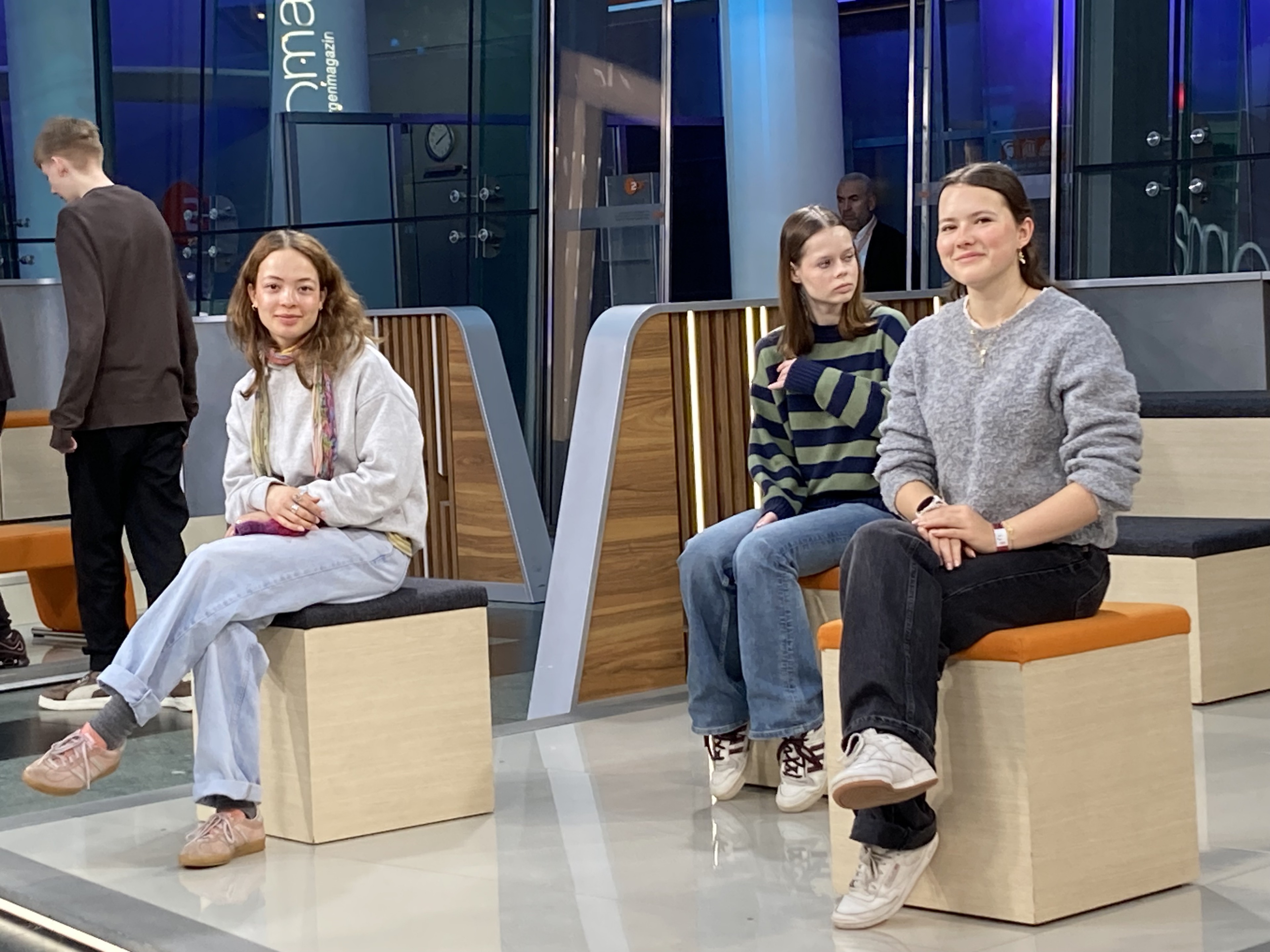 Während draußen in der Stadt langsam das Leben beginnt, herrscht hier drinnen schon seit Stunden Hochbetrieb. “Bitte guckt immer auf die Moderatoren”, wird uns gesagt. Eine Kamera fährt lautlos an uns vorbei. Es ist beeindruckend zu sehen, wie viel Technik und Planung nötig sind, damit später alles im Fernsehen so locker und selbstverständlich funktioniert. Im Studio fallen uns sofort die Bänke und der Hintergrund auf – genau das, was man sonst nur vom Bildschirm kennt. Doch in Wirklichkeit wirkt alles etwas kleiner, aber sehr beeindruckend. Überall stehen Monitore, Kabel liegen überall auf dem Boden und in der Regie sitzt ein Team, das jede Sekunde im Blick hat. Ein Mitarbeiter erklärt uns: ‚Jetzt zählt jede Minute. Wenn ein Beitrag zu lang ist, müssen wir spontan entscheiden, was wir kürzen.‘ Diese Schnelligkeit spürt man auch in der Atmosphäre, alles ist konzentriert und genau durchgeplant. Fehler sind jetzt nicht mehr erlaubt.