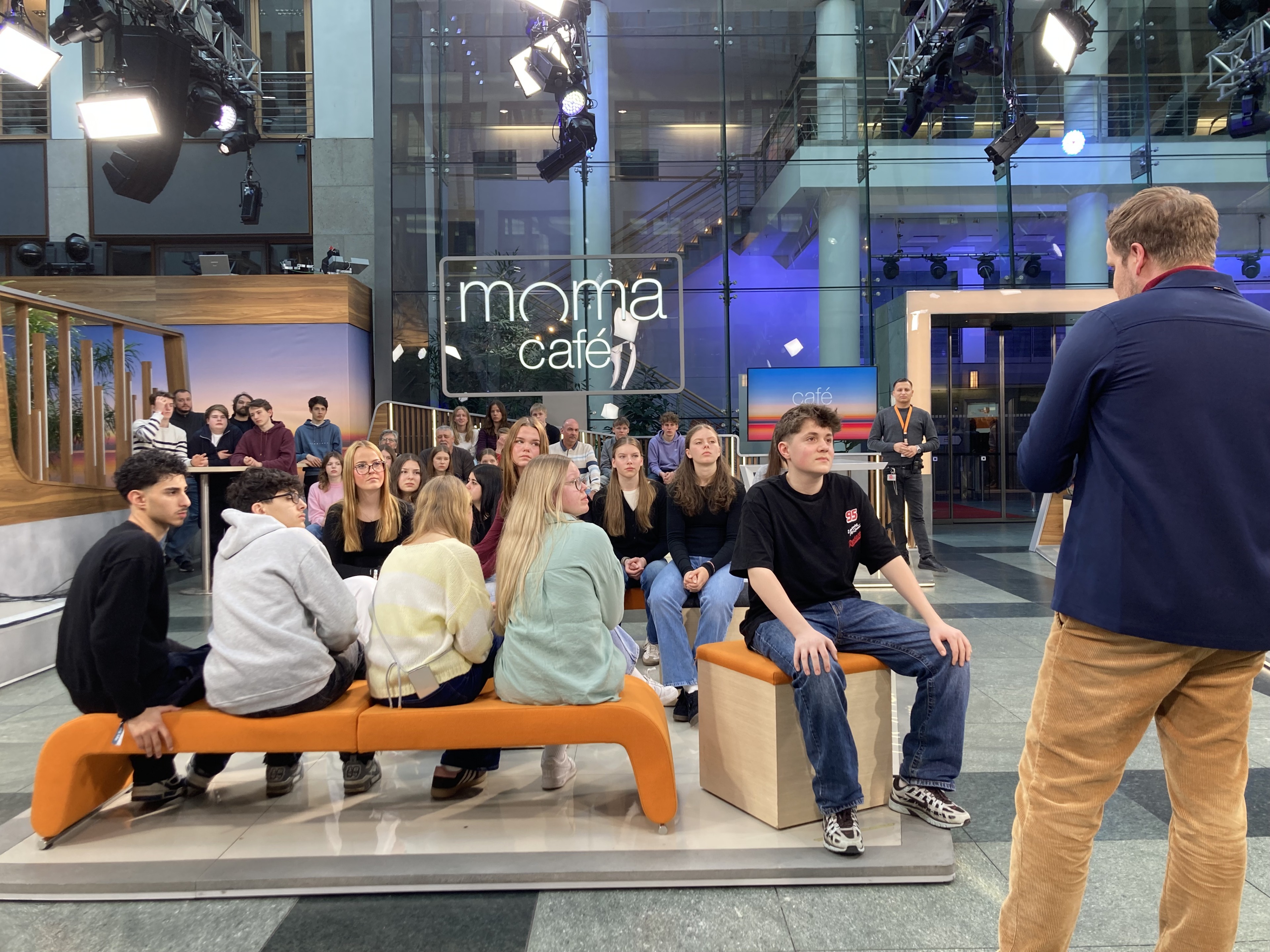 Es wird besonders spannend, als wir die Moderatoren aus nächster Nähe sehen. Sie wirken viel nahbarer als im Fernsehen, fast wie ganz normale Menschen. Wären da nicht das perfekte Make-up und das helle Studiolicht, könnte man sie fast für Freunde halten. Die Moderatoren stehen meist in der Mitte des Raumes, während die Gäste auf den Bänken Platz nehmen. Dadurch entsteht eine lockere, fast wohlfühlende Stimmung, obwohl gleichzeitig Millionen Menschen zuschauen.