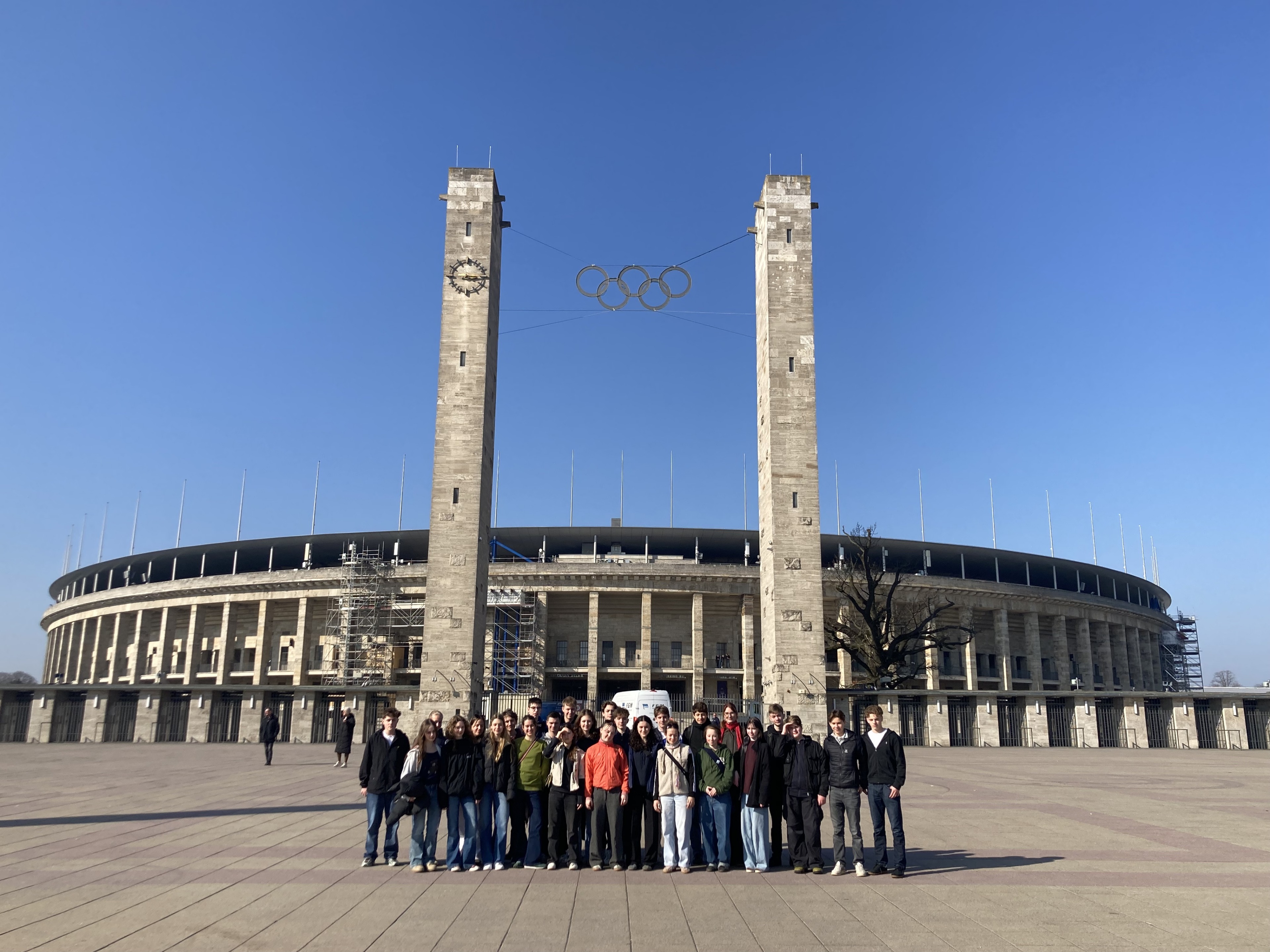 „Ein paar Schritte durch einen dunklen Tunnel dann blendet uns plötzlich das Licht. Vor uns öffnet sich das riesige Olympiastadion Berlin. Die Tribünen wirken endlos, der Rasen liegt perfekt gepflegt in der Mitte und alles zusammen erscheint noch viel beeindruckender als im Fernsehen. ‚Hier passen über 70.000 Zuschauer rein‘, erklärt Eva, unsere nette Tourguide, während wir langsam weitergehen. Wir bleiben kurz stehen und versuchen, die Atmosphäre auf uns wirken zu lassen. Es ist nicht nur die Größe, die beeindruckt, sondern auch die besondere Stimmung dieses Ortes. Doch schnell wirk klar,dasss dieses Stadion weit mehr ist als nur eine sportstätte. Eva zeigt nach oben auf eine bestimmte Stelle. ‚Dort oben ist der sogenannte Führerstand‘, sagt sie. ‚Von dort aus hat Adolf Hitler die Olympischen Spiele 1936 verfolgt.‘ In diesem Moment verändert sich die Wahrnehmung des Stadions. Es wirkt plötzlich nicht mehr nur beeindruckend, sondern auch bedrückend. Die Geschichte dieses Ortes ist spürbar. Wir … erfahren von den Olympischen Spielen 1936, die stark von der nationalsozialistischen Propaganda geprägt waren. Gleichzeitig hören wir von Menschen, die dieses Bild durchbrochen haben. Besonders beeindruckend ist die Geschichte von Jesse Owens, der hier vier Goldmedaillen gewann und damit die rassistische Ideologie der Nationalsozialisten widerlegte. Auch die jüdische Fechterin Helene Mayer wird erwähnt, deren Teilnahme zeigt, wie widersprüchlich diese Zeit war. Solche Geschichten machen deutlich, dass Geschichte nicht nur aus Ereignissen besteht, sondern auch aus den Menschen, die sie geprägt haben. …