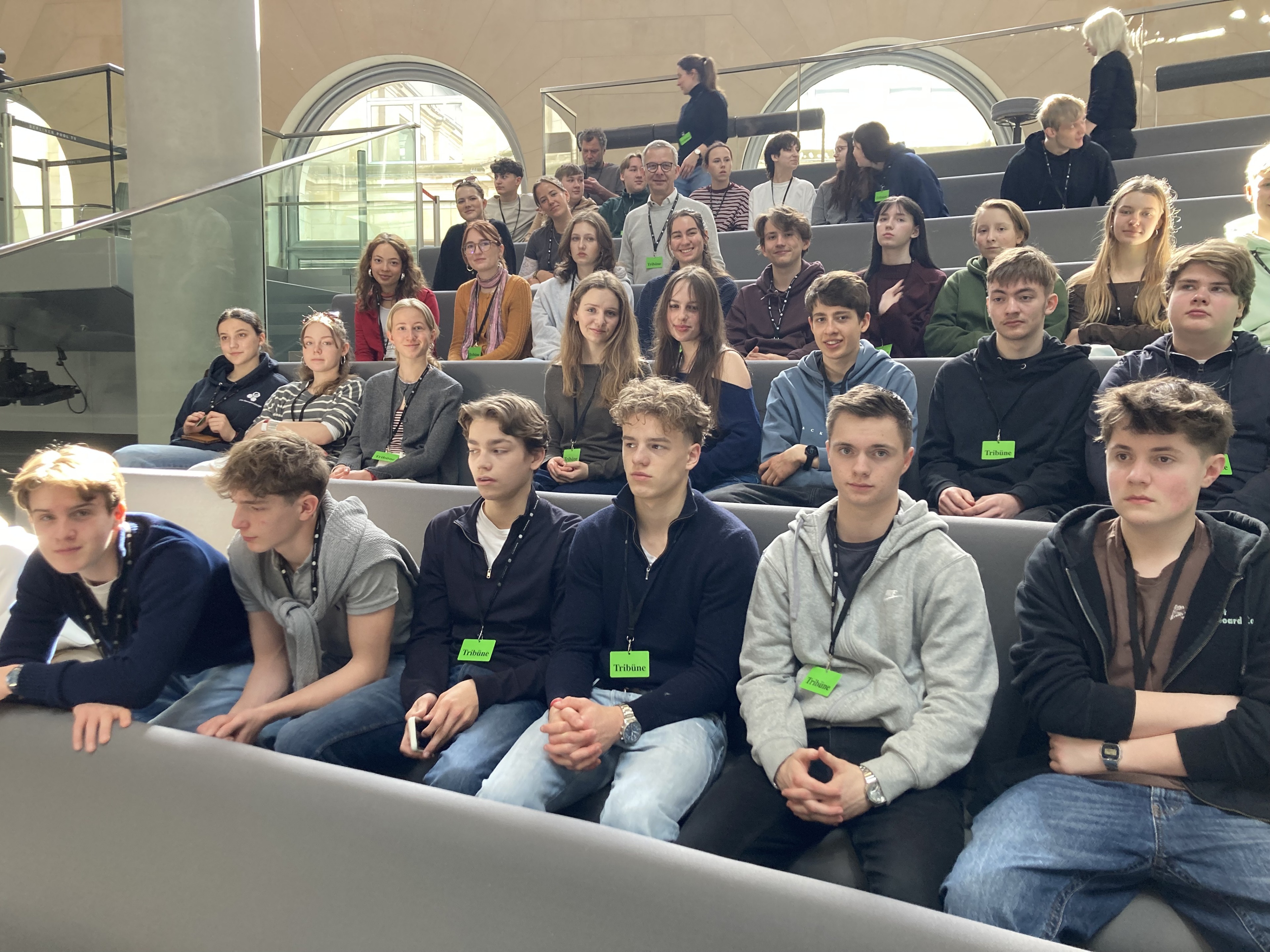 Unser Guide erklärt uns während der Führung, wie der Bundestag funktioniert. „Ein Gesetz kommt nicht einfach von heute auf morgen zustande”, sagt die Frau ins Mikrofon und blickt zu uns hoch. Wir sitzen mit ihr auf dem Balkon über dem Plenarsaal des Deutschen Bundestags. Von oben sehen wir die Plätze der Abgeordneten unten im Saal. In diesem Moment fühlte ich mich besonders, dass ich die Möglichkeit habe, den Bundestag zu besuchen und genau dort zu sein wo über viele Gesetze diskutiert wurde. … Sie zeigt uns Schritt für Schritt, wie neue Gesetze eingebracht, besprochen /diskutiert und am Ende beschlossen werden. Vorher wusste ich nicht, dass so viele Debatten und Lesungen notwendig sind, bis ein wirklich gutes und nötiges Gesetz verabschiedet ist. Während sie redet, schaue ich immer wieder nach unten in den Saal und stelle mir vor, wie dort diskutiert wird. … Nach dem Vortrag dürfen wir nach oben auf den Außenbalkon. Die Sonne schien, man sah fast gar keine Wolken und es war relativ warm. Wir sind mit Freunden durch die ganze Veranda gelaufen und haben diese Atmosphäre genossen und Bilder gemacht. Und auf einmal ruft jemand: ‚Schaut mal da!‘ Unten sehen wir durch ein Fenster Alice Weidel. Zuerst sind wir noch unsicher, weil sie mit dem Rücken zu uns stand, aber dann erkennen wir sie klar. Ich war in diesem Moment richtig überrascht. Es war ein komisches, aber auch ein spannendes Gefühl, eine Politikerin, die man sonst nur aus dem Fernsehen kennt, plötzlich in echt zu sehen. Da habe ich gemerkt, dass Politik gar nicht so weit weg ist, sondern genau hier passiert.“ (Mascha/ Nikita)