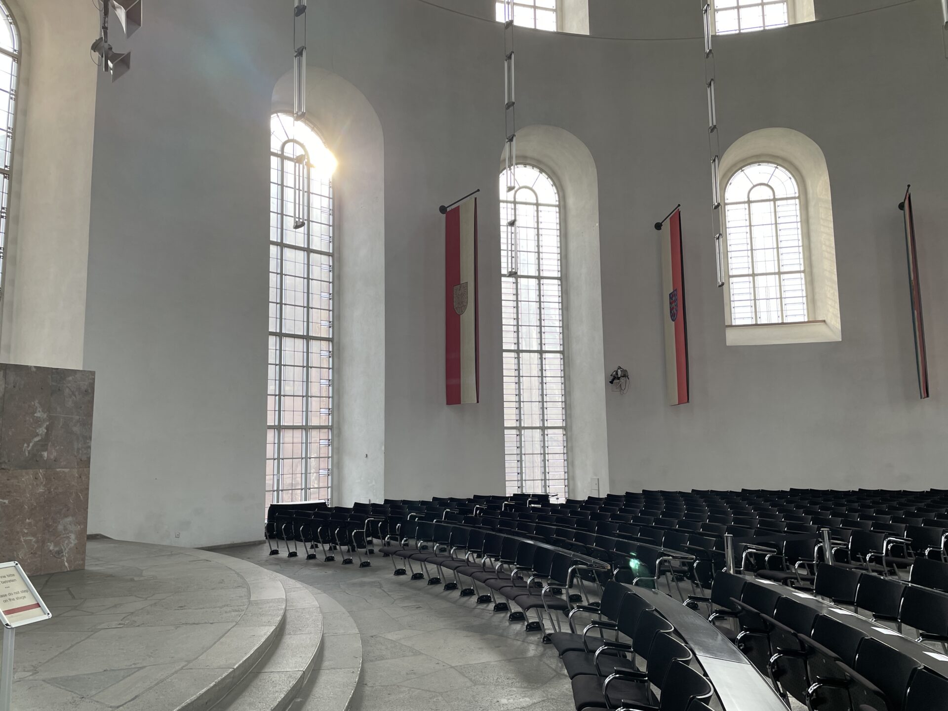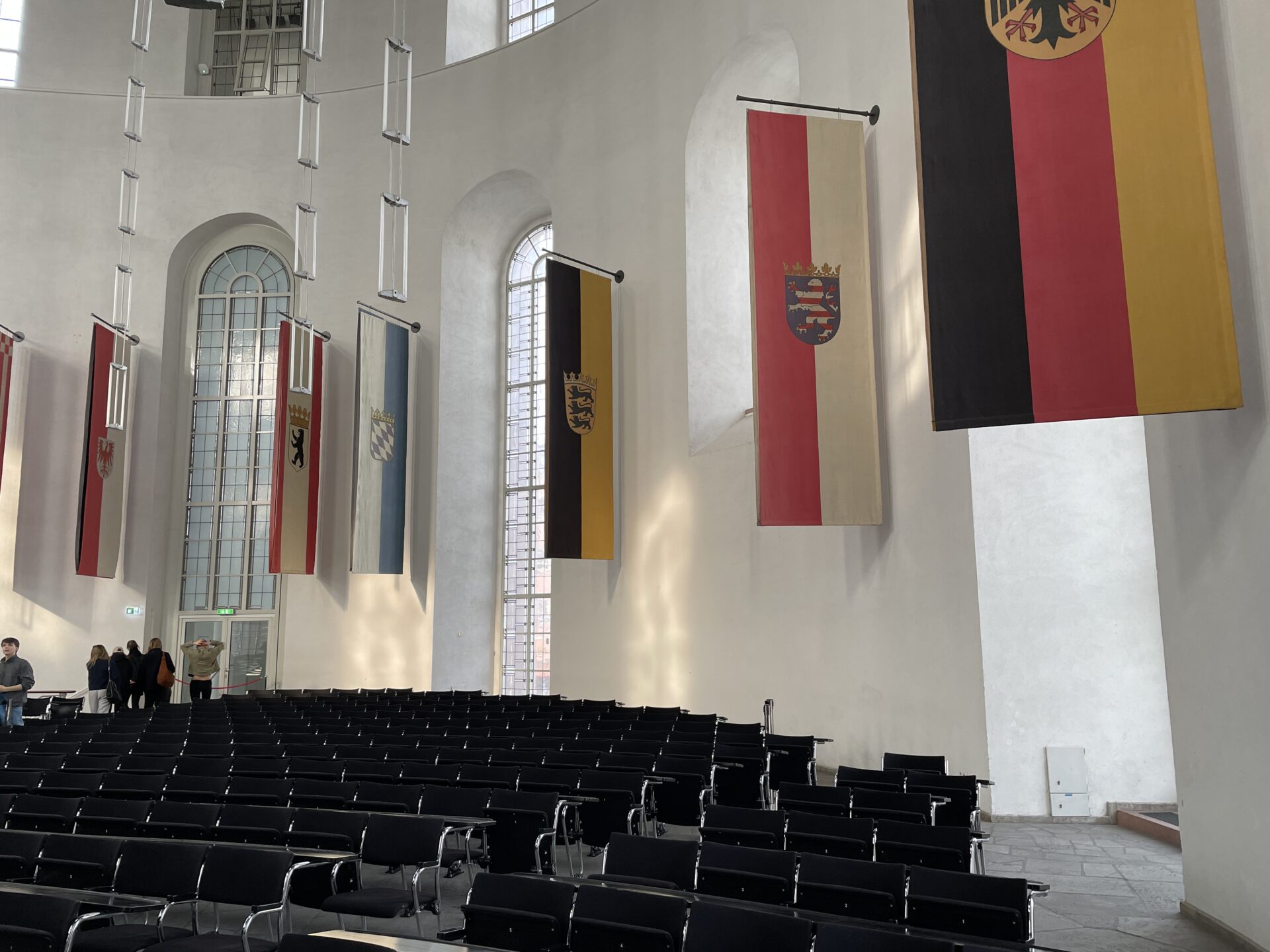 Wir haben uns ausgiebig mit der Geschichte Frankfurts beschäftigt, insbesondere mit der Revolution von 1848. Im Rahmen einer Stadtführung erfuhren wir mehr über die politischen Ereignisse jener Zeit, die Frankfurt maßgeblich prägten. Besonders intensiv haben wir uns mit der Paulskirche auseinandergesetzt, die als Wiege der deutschen Demokratie gilt. Wir bekamen die Möglichkeit, das Gebäude genauer zu erkunden und mehr über seine Bedeutung für die deutsche Geschichte zu erfahren.