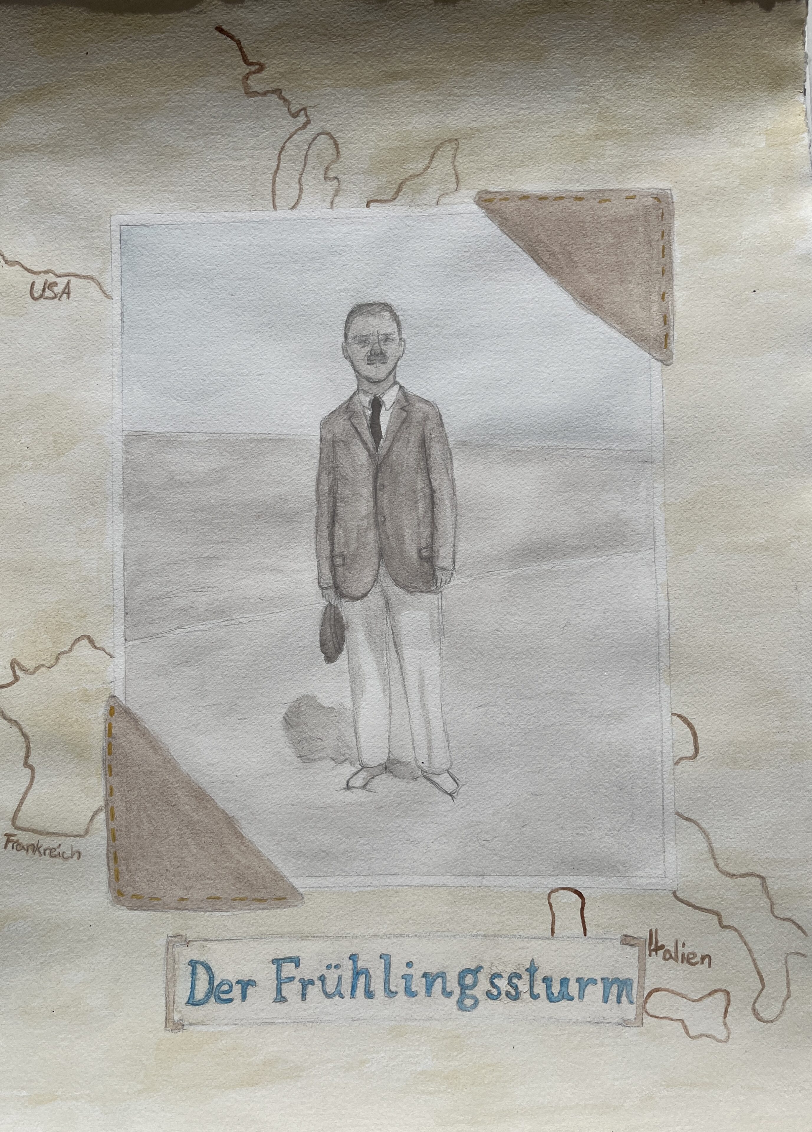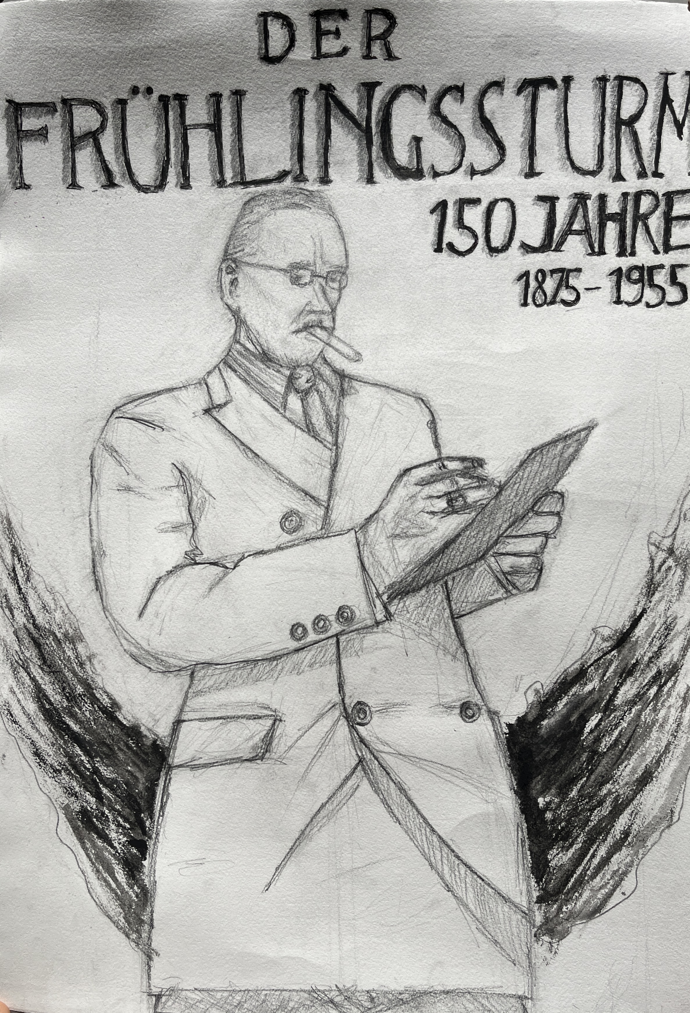 Diese Eindrücke flossen in unsere ersten Entwürfe ein: Wir wählten Bilder und Zitate aus und entwickelten verschiedene thematische Ansätze. Dabei hatten viele direkt eine Gestaltungsidee, da wir uns alle ein Lebensthema des großen Dichters herausgesucht hatten, um dieses in den Mittelpunkt der Gestaltung zu stellen. Dabei arbeiteten wir digital und analog.