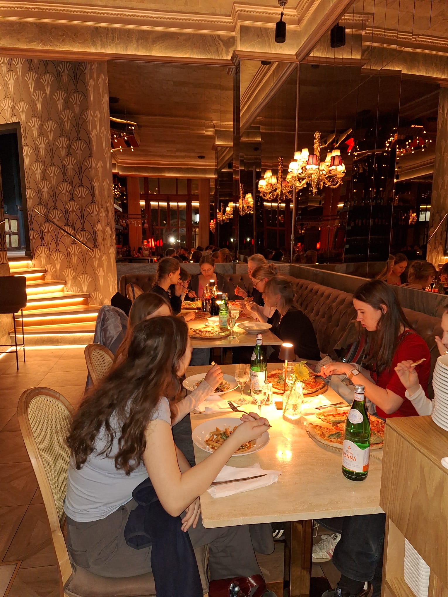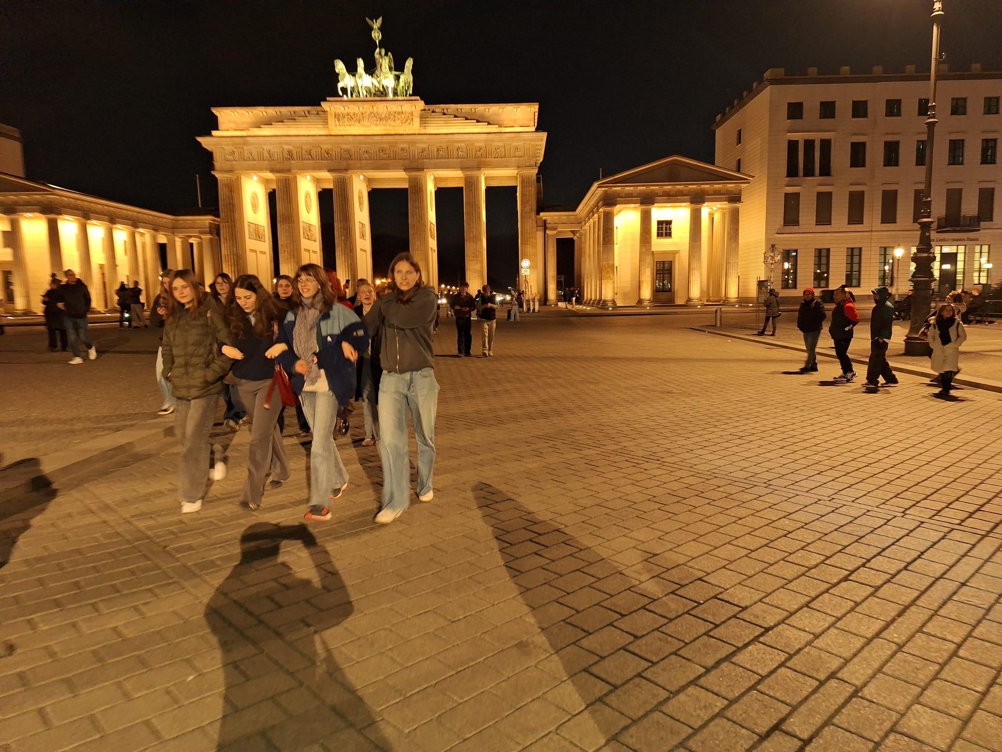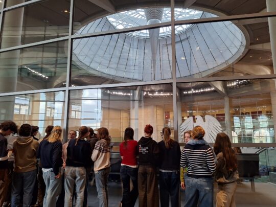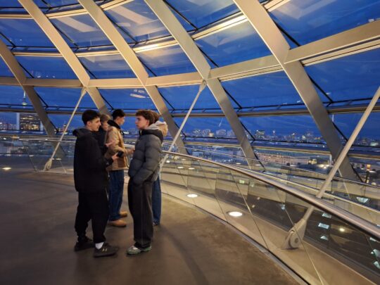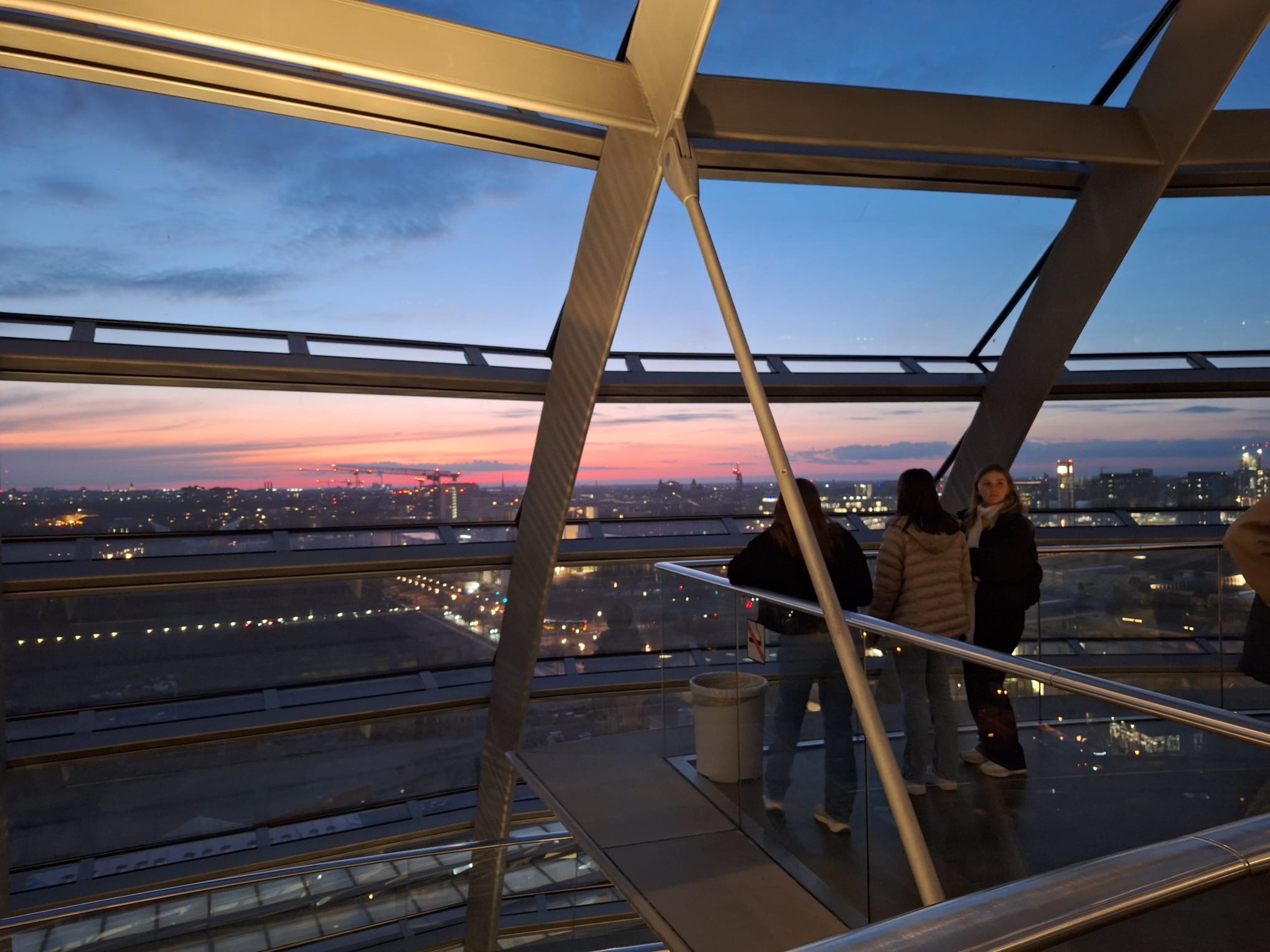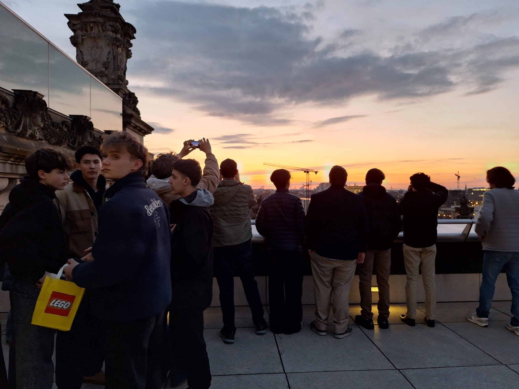 Nachmittags besuchten wir den Deutschen Bundestag. Nach einem Sicherheitscheck bekamen wir auf der Besuchertribüne einen spannenden Vortrag über die Arbeitsweise und die Architektur des Parlaments. Anschließend hatten wir die Gelegenheit, mit Tim Klüssendorf, dem Lübecker Politiker und neuen Generalsekretär der SPD, ins Gespräch zu kommen – eine tolle Gelegenheit, unsere eigenen Fragen zur Politik loszuwerden. Zum Abschluss genossen wir die Aussicht des Sonnenuntergangs von der Kuppel des Reichstagsgebäudes. Gemeinsam rundeten wir den Tag bei einem leckeren Abendessen in der Pizzeria Marienkäfer ab.
