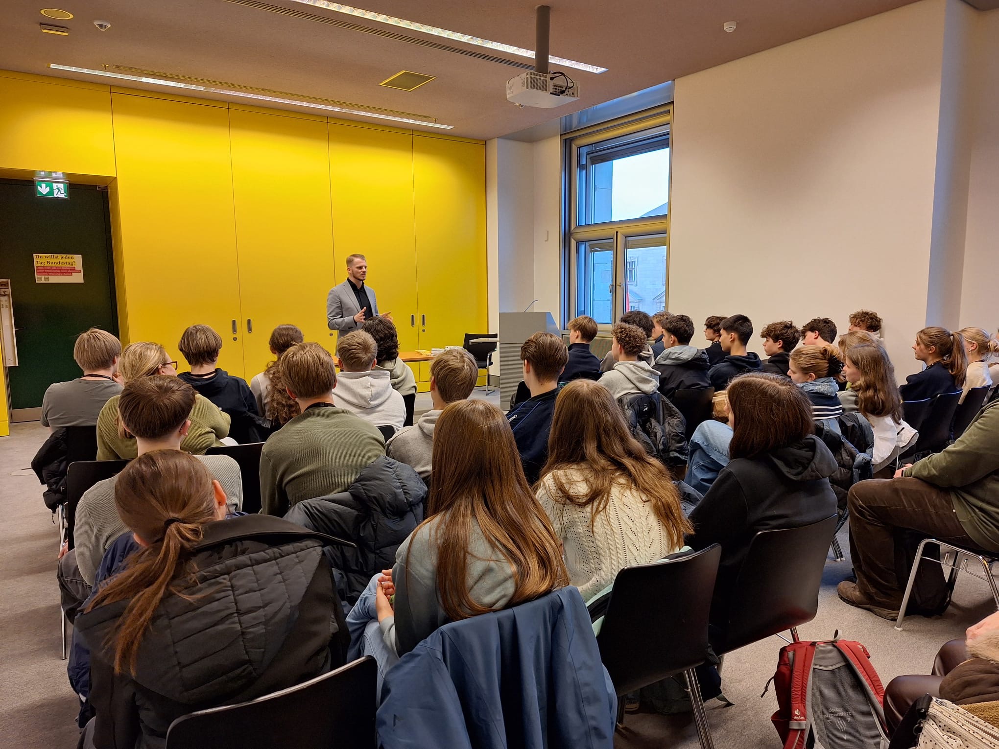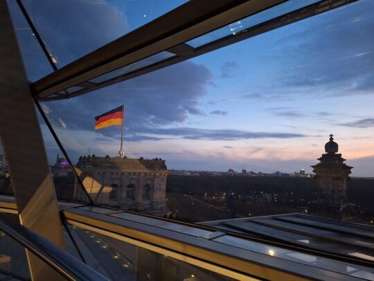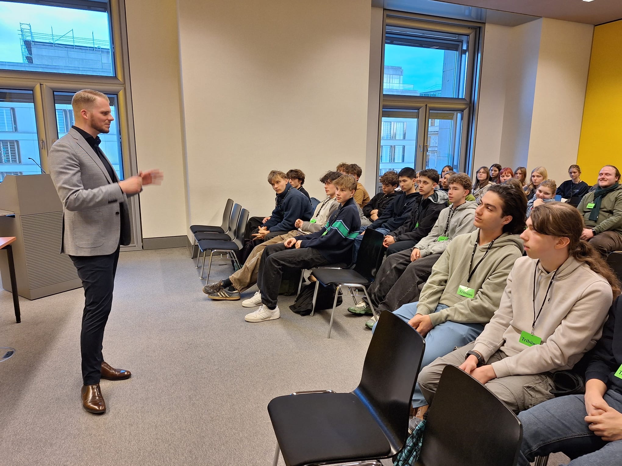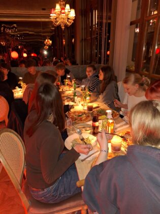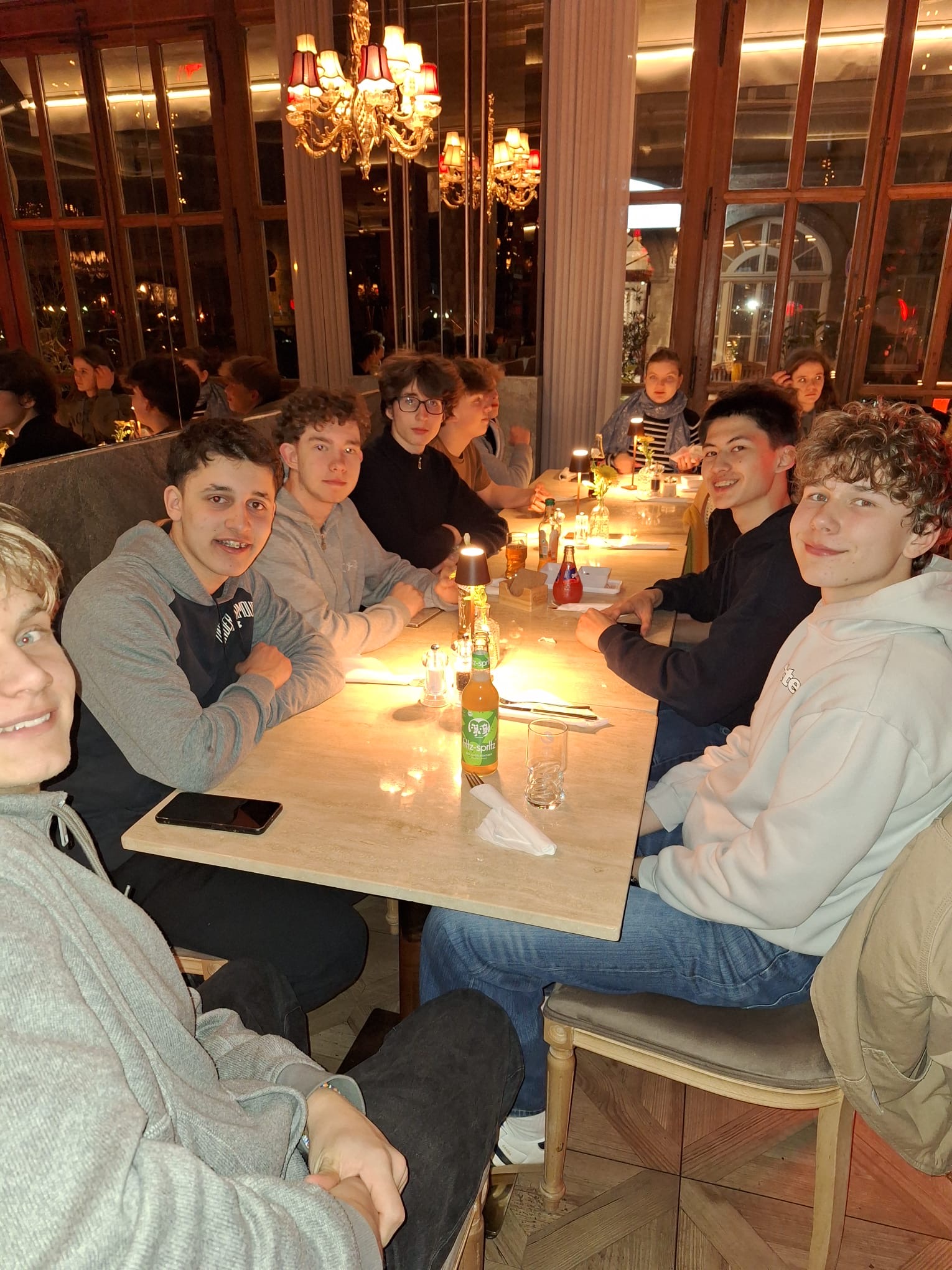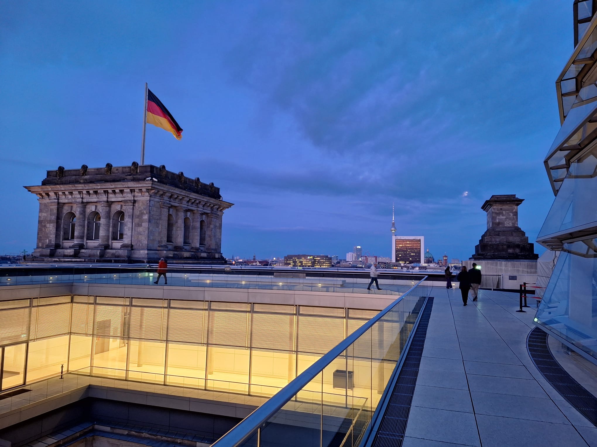 Nachmittags besuchten wir den Deutschen Bundestag. Nach einem Sicherheitscheck bekamen wir auf der Besuchertribüne einen spannenden Vortrag über die Arbeitsweise und die Architektur des Parlaments. Anschließend hatten wir die Gelegenheit, mit Tim Klüssendorf, dem Lübecker Politiker und neuen Generalsekretär der SPD, ins Gespräch zu kommen – eine tolle Gelegenheit, unsere eigenen Fragen zur Politik loszuwerden. Zum Abschluss genossen wir die Aussicht des Sonnenuntergangs von der Kuppel des Reichstagsgebäudes. Gemeinsam rundeten wir den Tag bei einem leckeren Abendessen in der Pizzeria Marienkäfer ab.