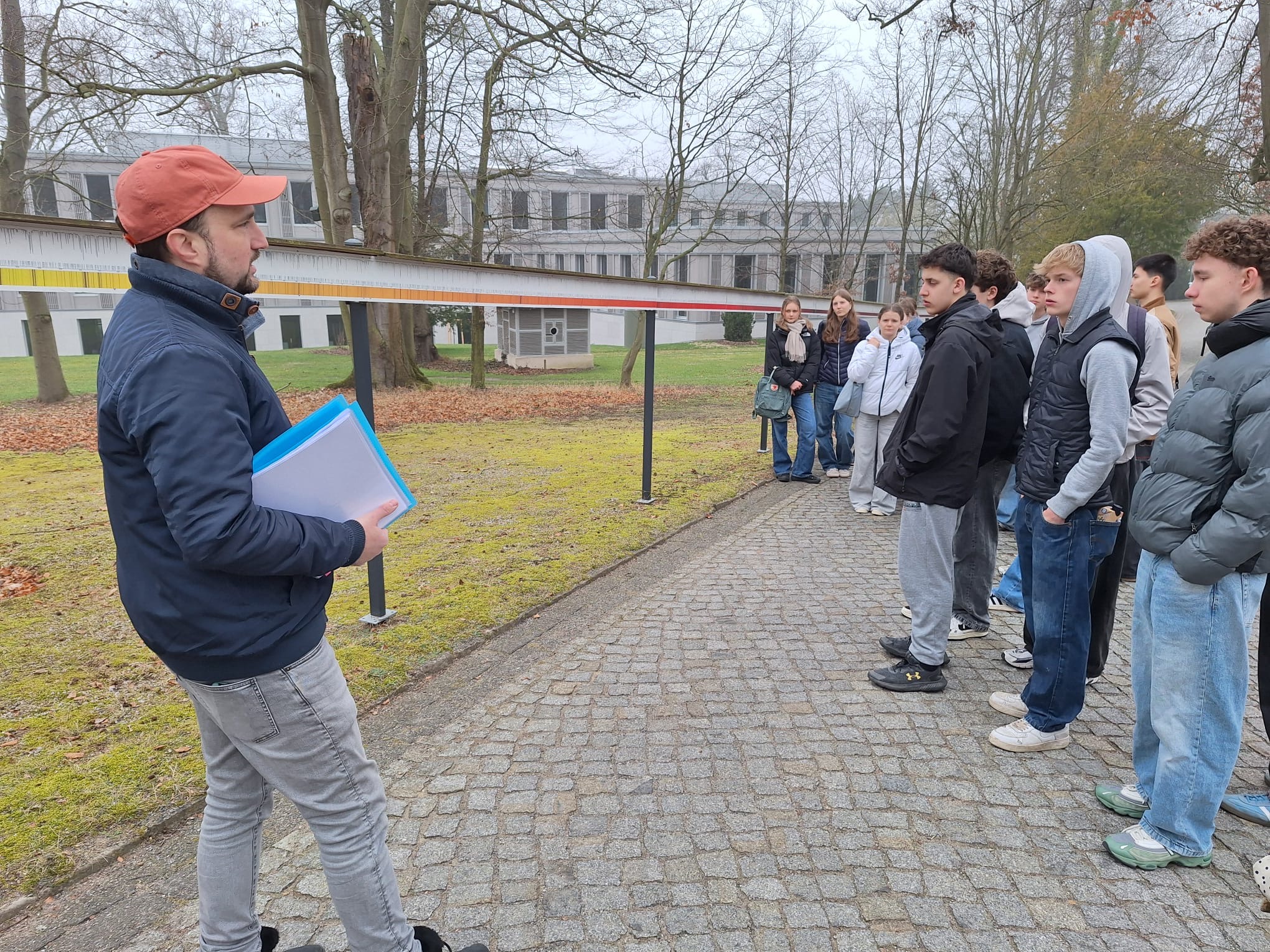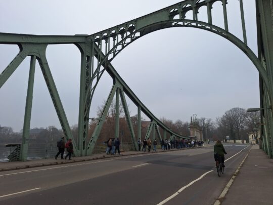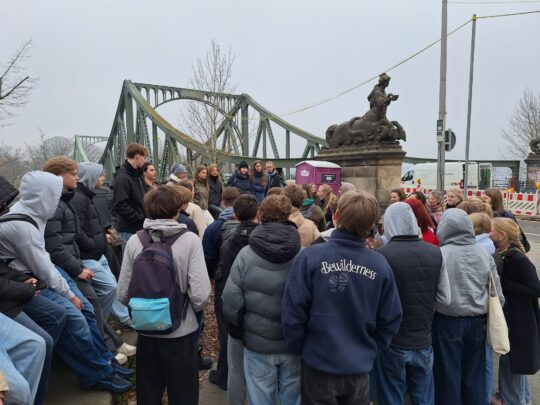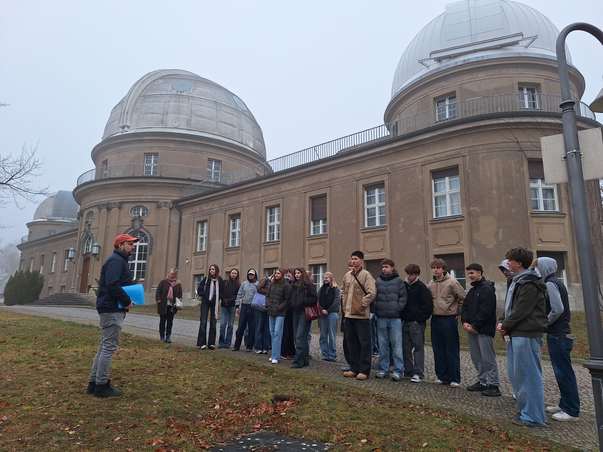 Gleich zu Beginn des zweiten Tages besuchten wir das Leibniz-Institut für Astrophysik Potsdam (AIP). In einem spannenden Vortrag erhielten wir Einblicke in aktuelle Forschungsthemen wie Sonnenphysik, Galaxieentwicklung und Weltraumteleskope. Besonders beeindruckend war, dass genau hier einige der ältesten astrophysikalischen Einrichtungen Deutschlands stehen. Im Anschluss führte uns Herr Meitner über die Glienicker Brücke. In einem kurzen Vortrag erläuterte er die Bedeutung dieses historischen Ortes als Agentenaustauschpunkt während des Kalten Krieges.