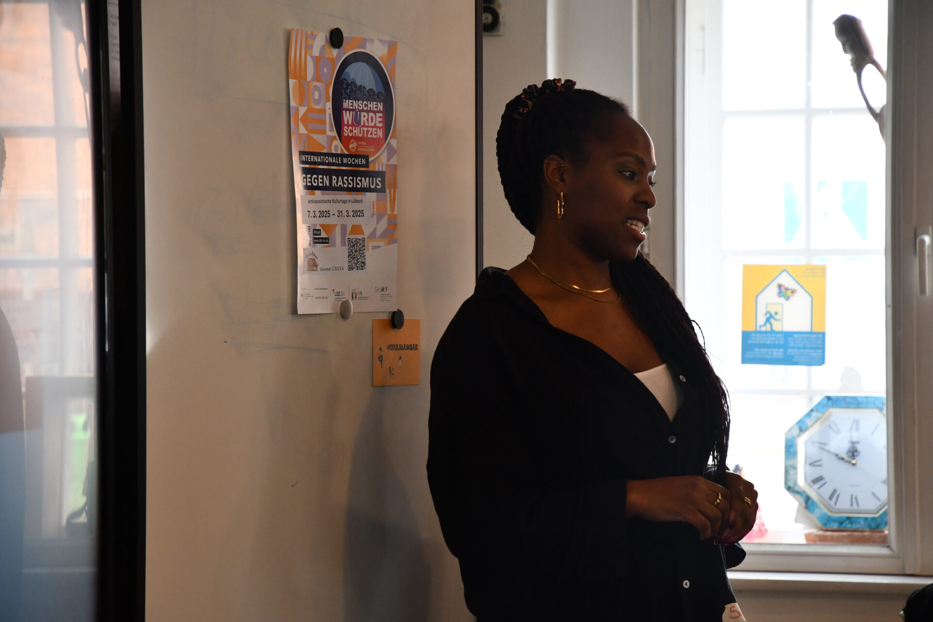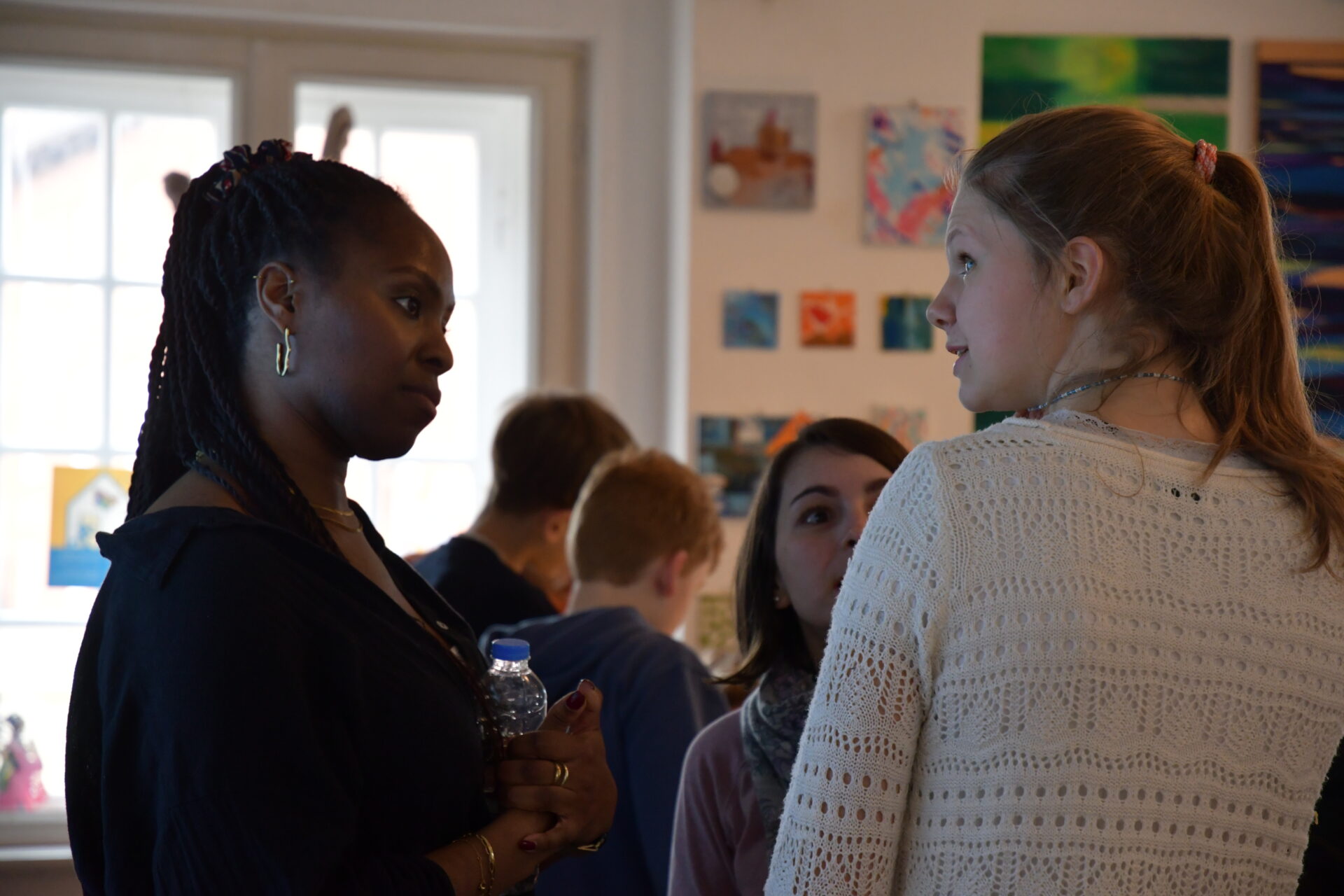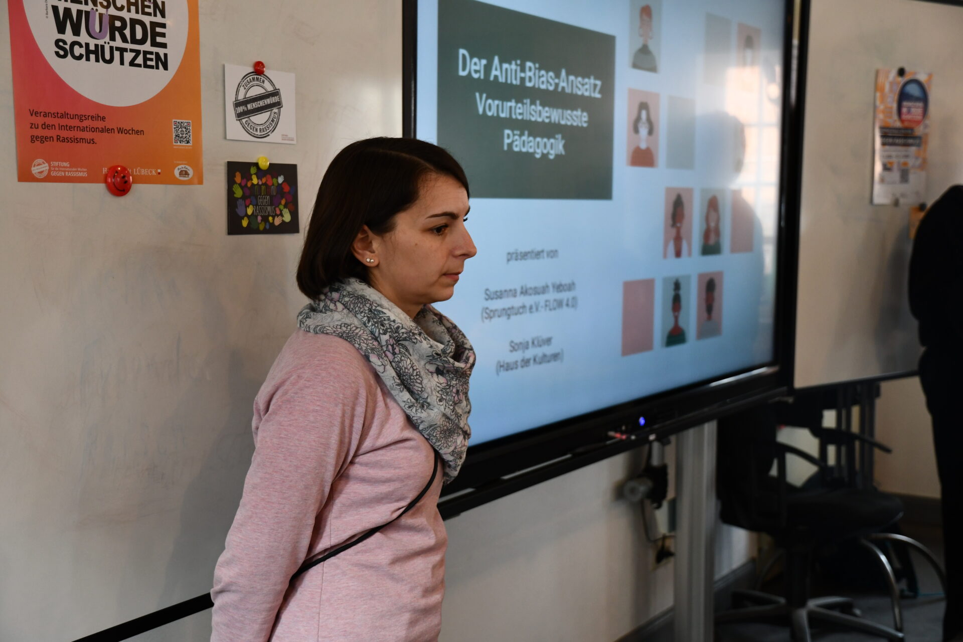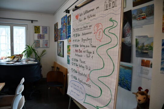 Angekommen im Haus der Kulturen gab es erstmal eine beidseitige Vorstellungsrunde, schon hier wurde klar, wie viele unterschiedliche Interessen und Hobbies in der 5a vertreten sind. Danach hielten die beiden Teamerinnen einen Vortrag über das Anti-Bias Konzept, in dem sie erklärten, was Vorurteile sind und wie man sie überwindet.