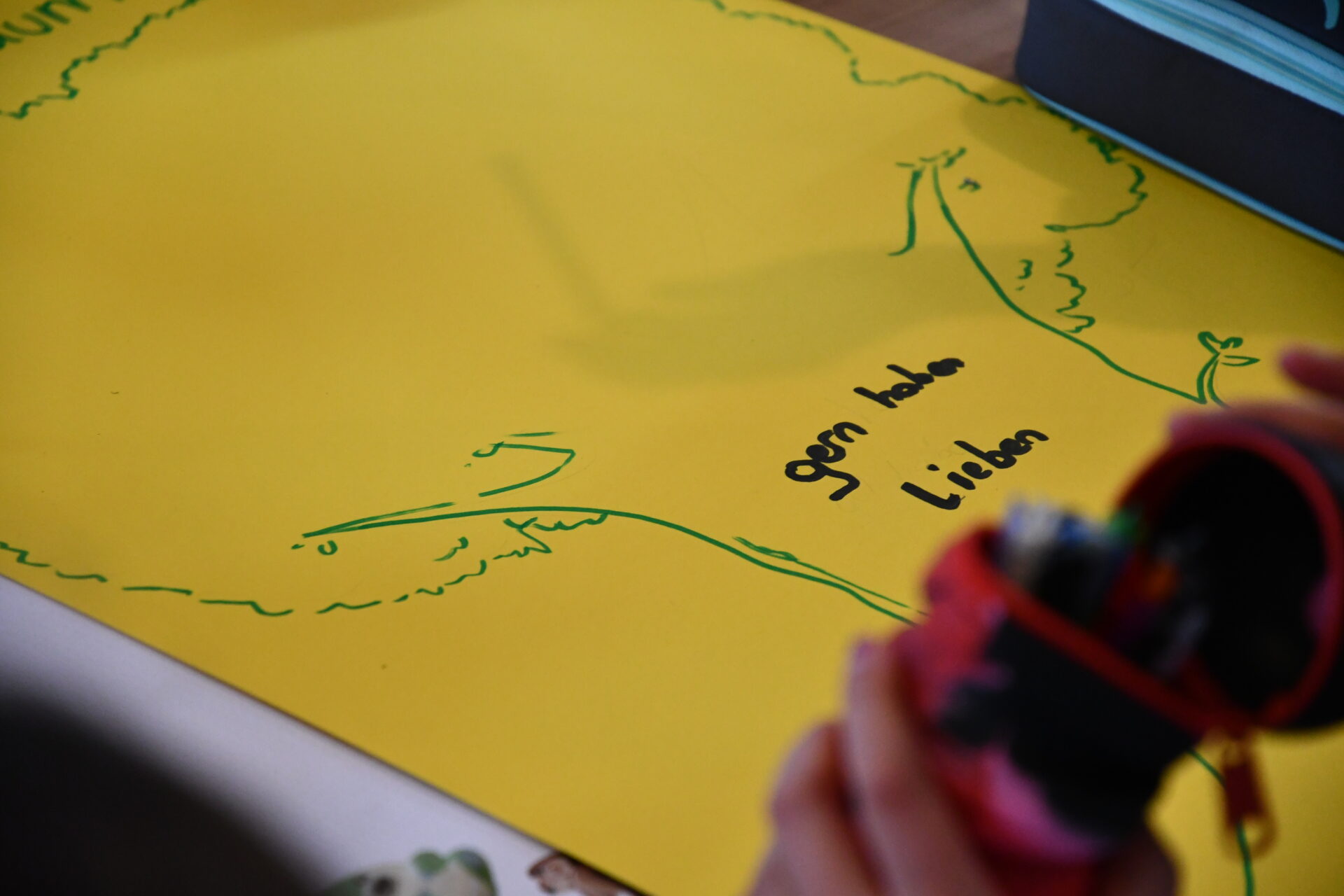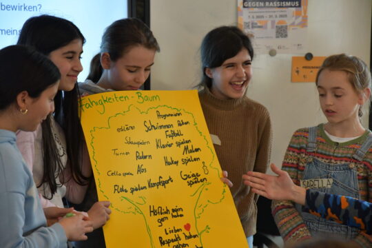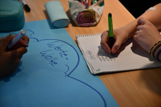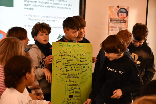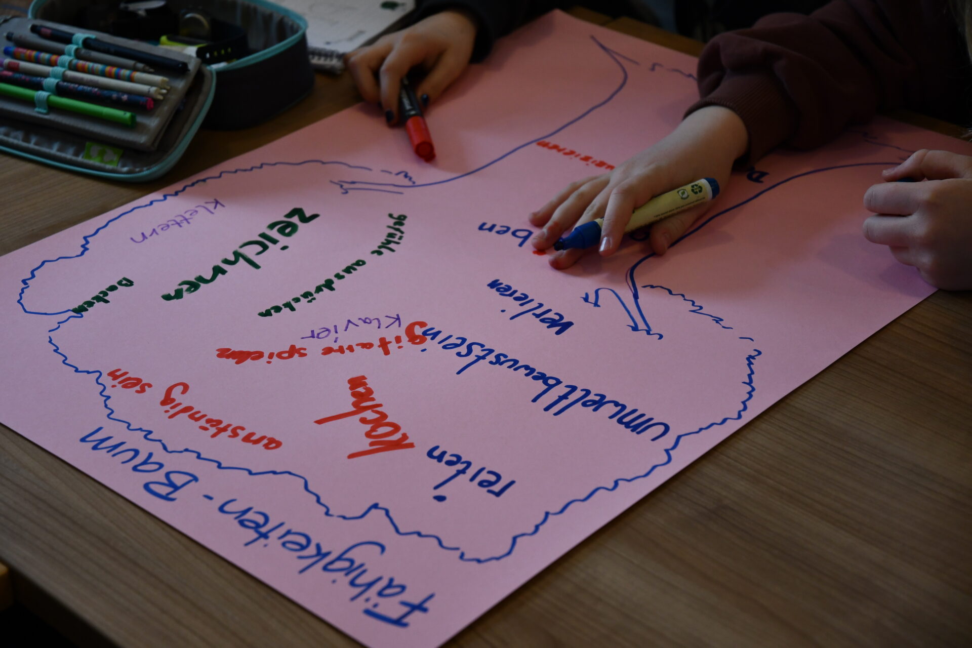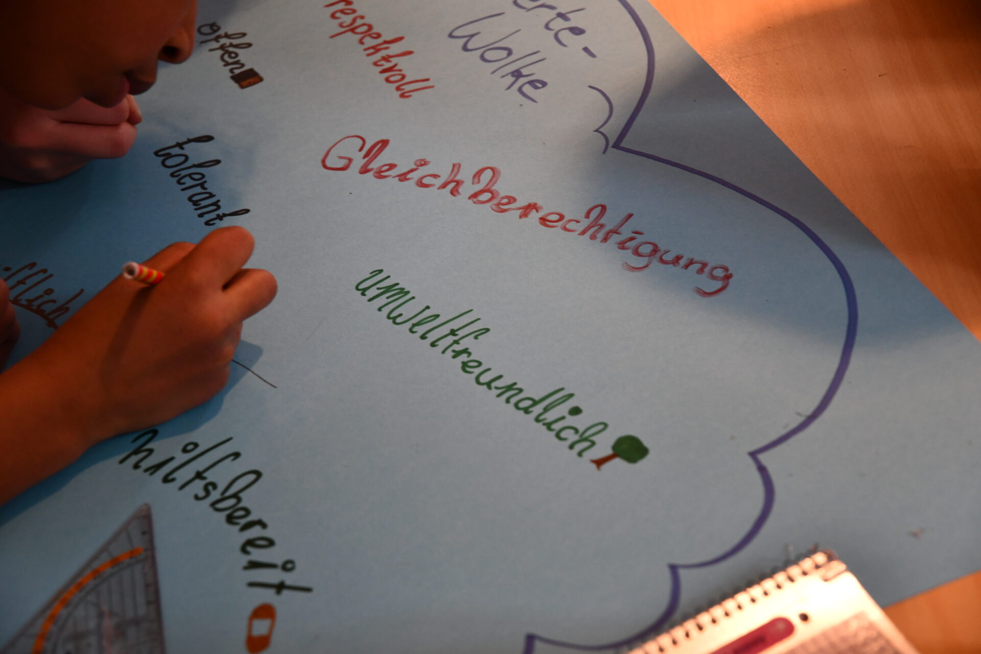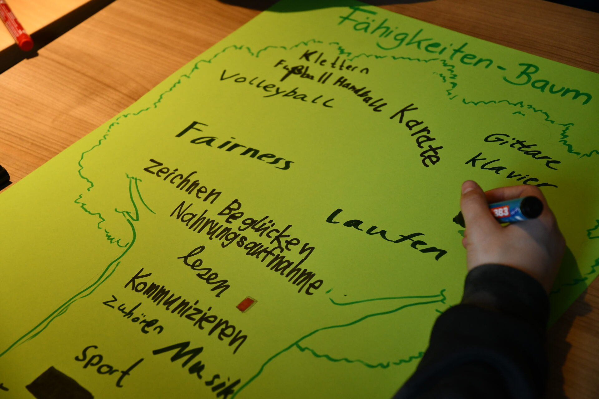 Nach einer kurzen Pause, die natürlich zum Spielen auf der Domwiese genutzt wurde, ging es an das Gestalten von unterschiedlichen Plakaten. Die Kinder konnten zwischen dem “Fähigkeiten-Baum” und der “Werte-Wolke” wählen: Bei ersterem sollten alle Fähigkeiten, die alle Kinder der Klasse beherrschen, in den Stamm geschrieben werden und die, die nur einzelne können, in die Baumkrone. Dadurch sollte sichtbar werden, wie viel eine Gemeinschaft kann, wenn die unterschiedlichen Stärken der einzelnen gefördert und genutzt werden.