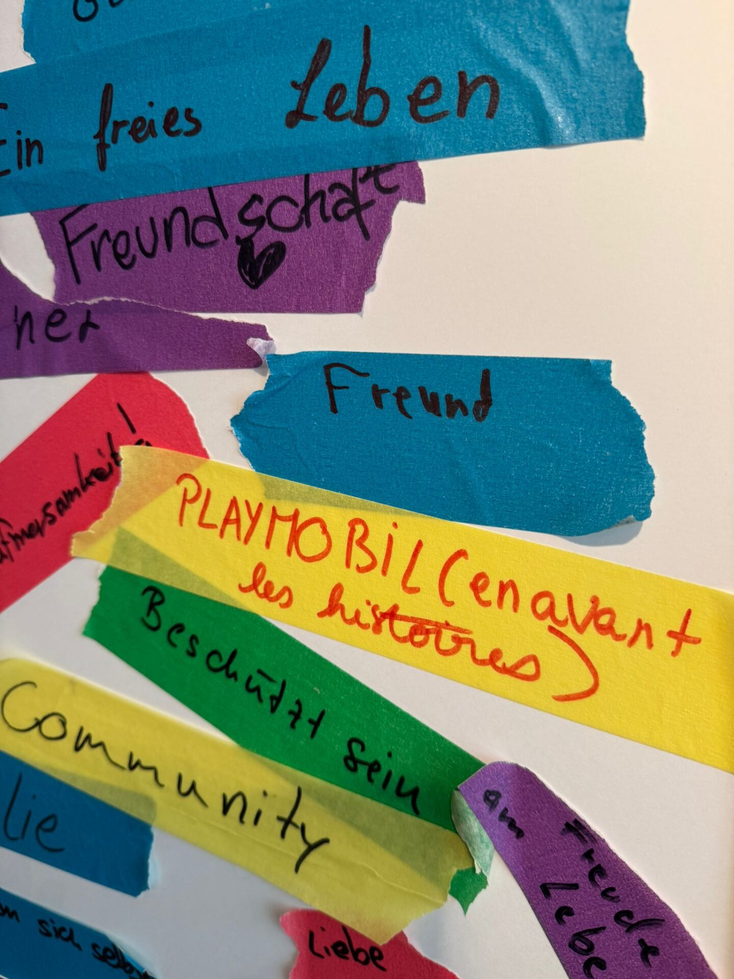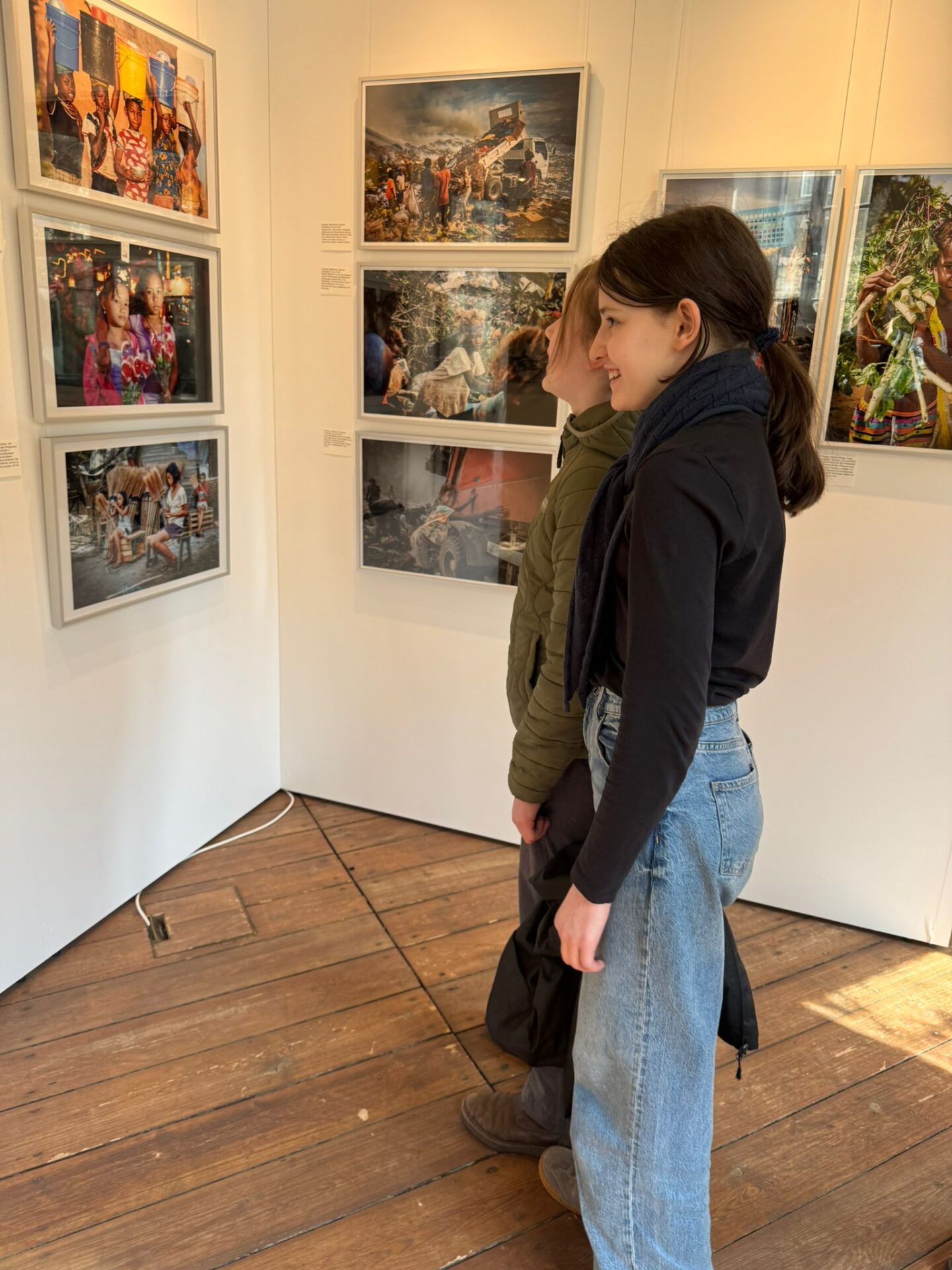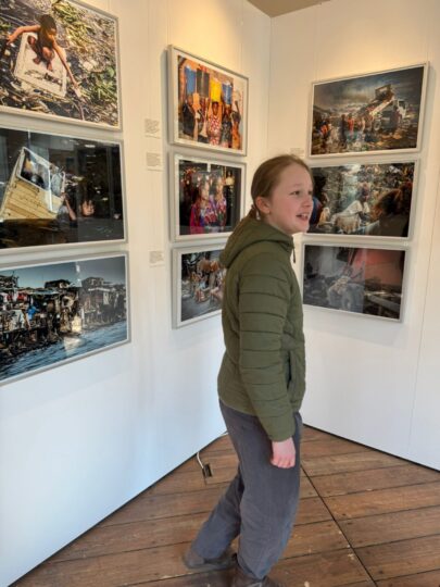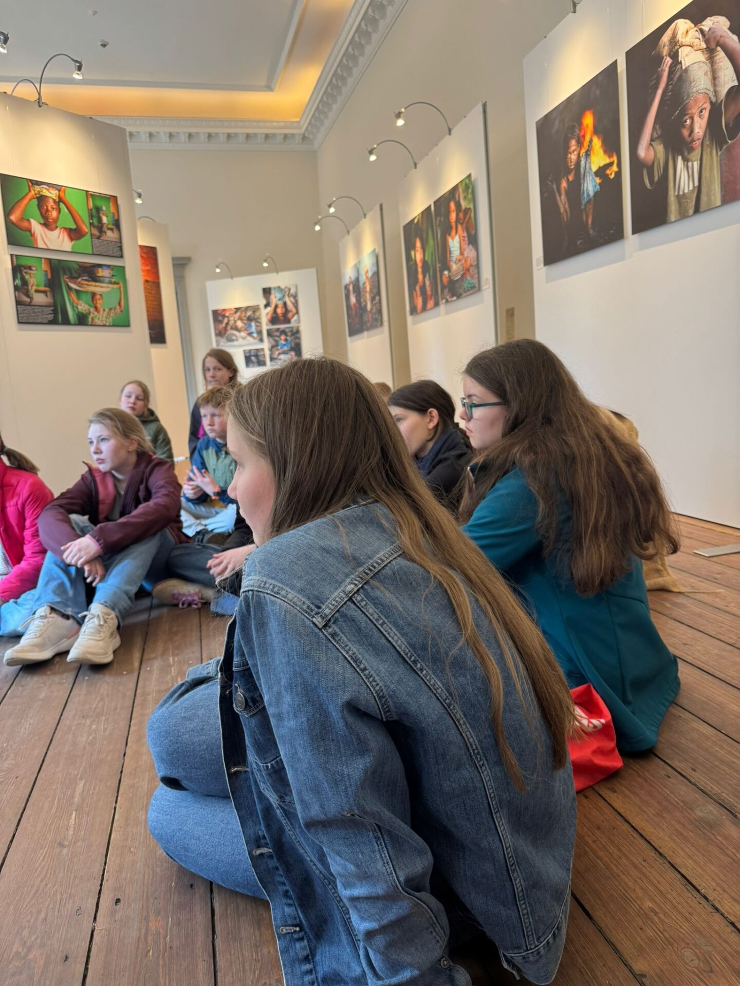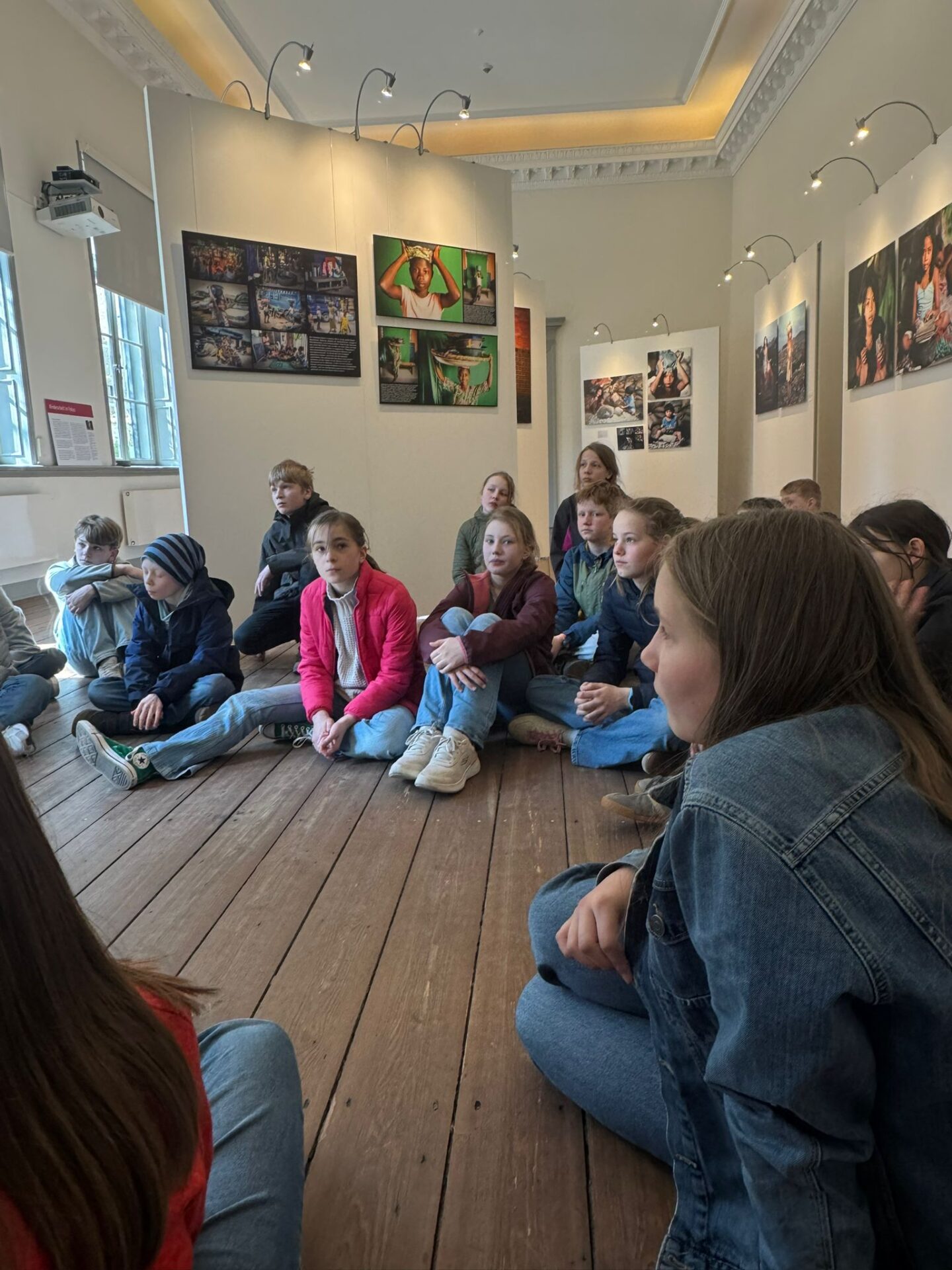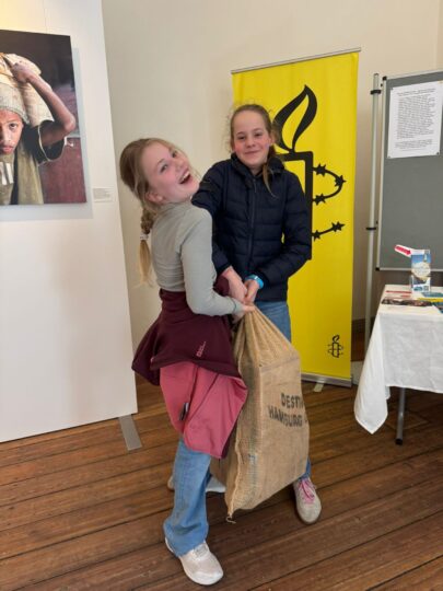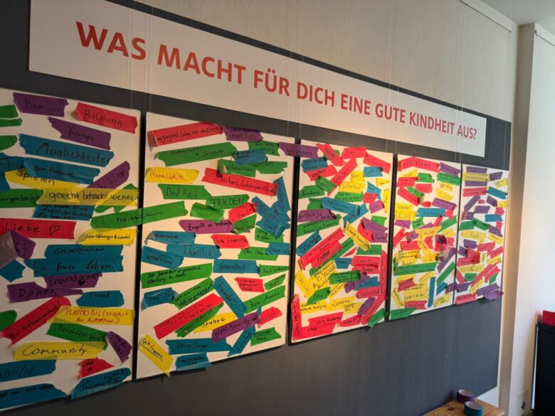Zum Abschluss der Einheit haben wir die Ausstellung zur Kinderarbeit im benachbarten Willy Brandt-Haus besucht. Es erwartete uns eine sehenswerte Fotoausstellung mit zum Teil interaktiven Elementen. Man war aufgefordert einen 20 Kilo schweren Sandsack anzuheben, den einige Kinder in ihrem Heimatland über weite Strecken täglich tragen müssen. Eine wachsende Mindmap zur Frage „Was macht für Dich eine gute Kindheit aus?“ wurde von uns erweitert.