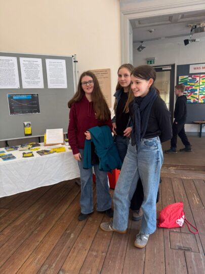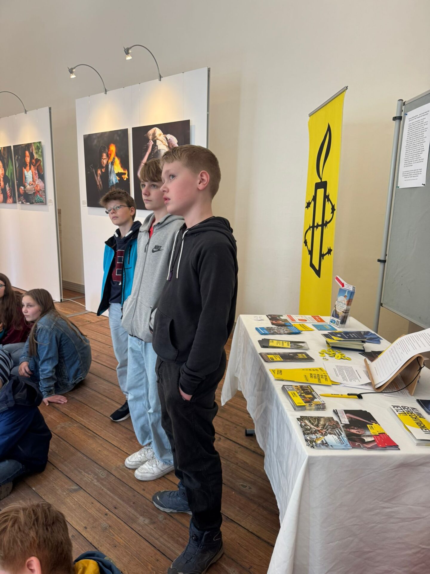 Herr Richter (Amnesty International und ehemaliger Lehrer der OzD) führte uns durch die Ausstellung und konnte vieles Wissenwerte erzählen. So war er selbst, noch als aktiver Lehrer, mit einer Schülergruppe in Sri Lanka, dort haben sie Kinder gesehen, die kilometertief in enge und dunkle Felsspalten abgeseilt wurden, um Mondsteine zu „ernten“. Mondsteine sind Edelsteine, die in günstigen Modeschmuck oder Kosmetkprodukten verarbeitet werden.
