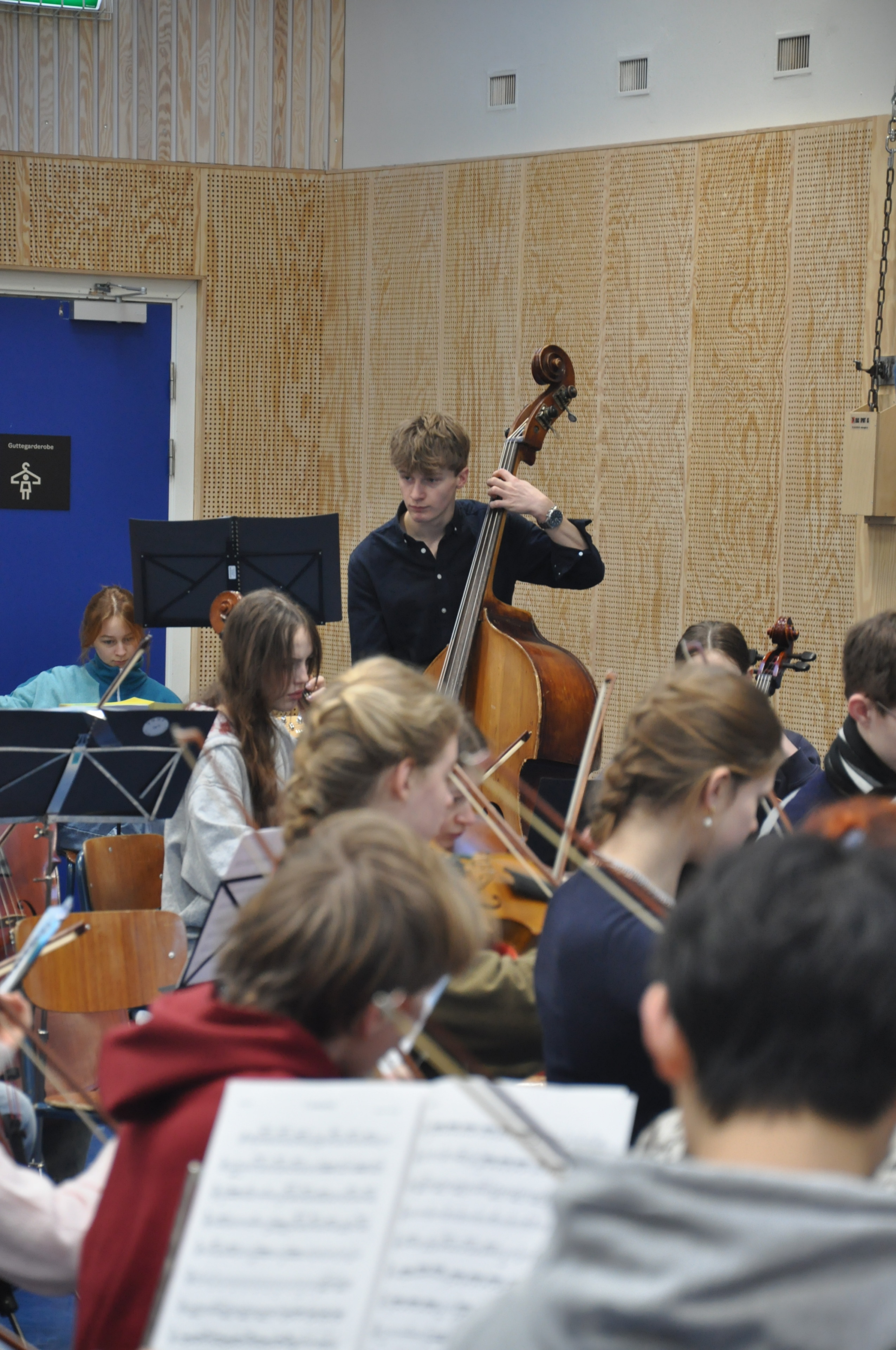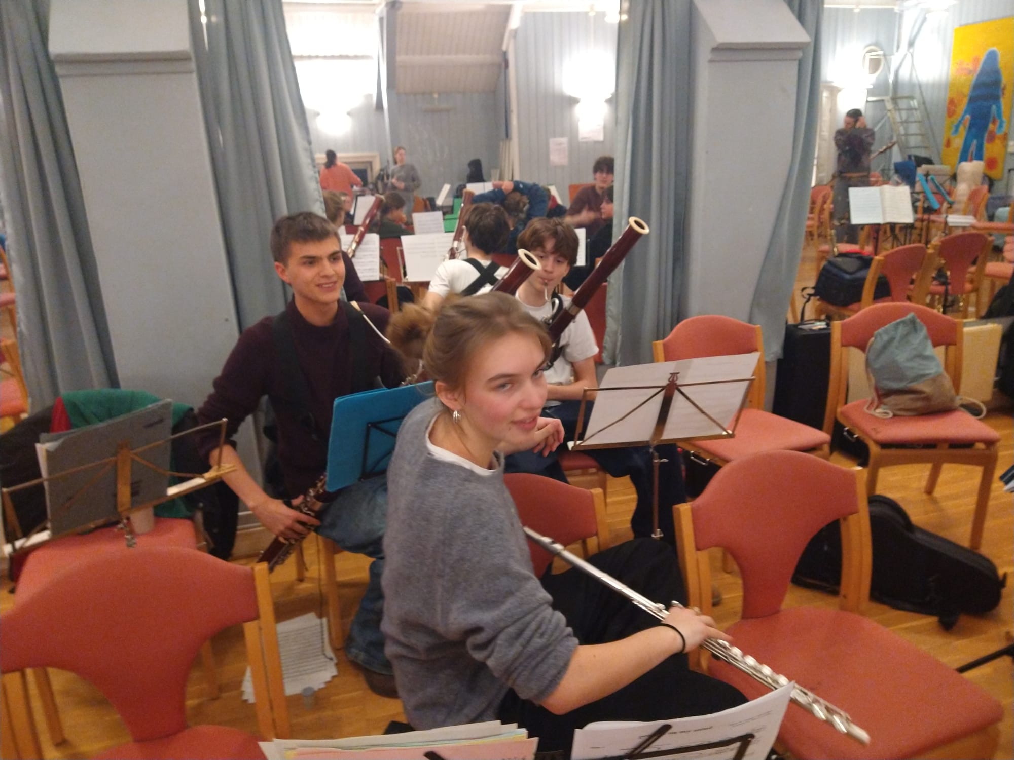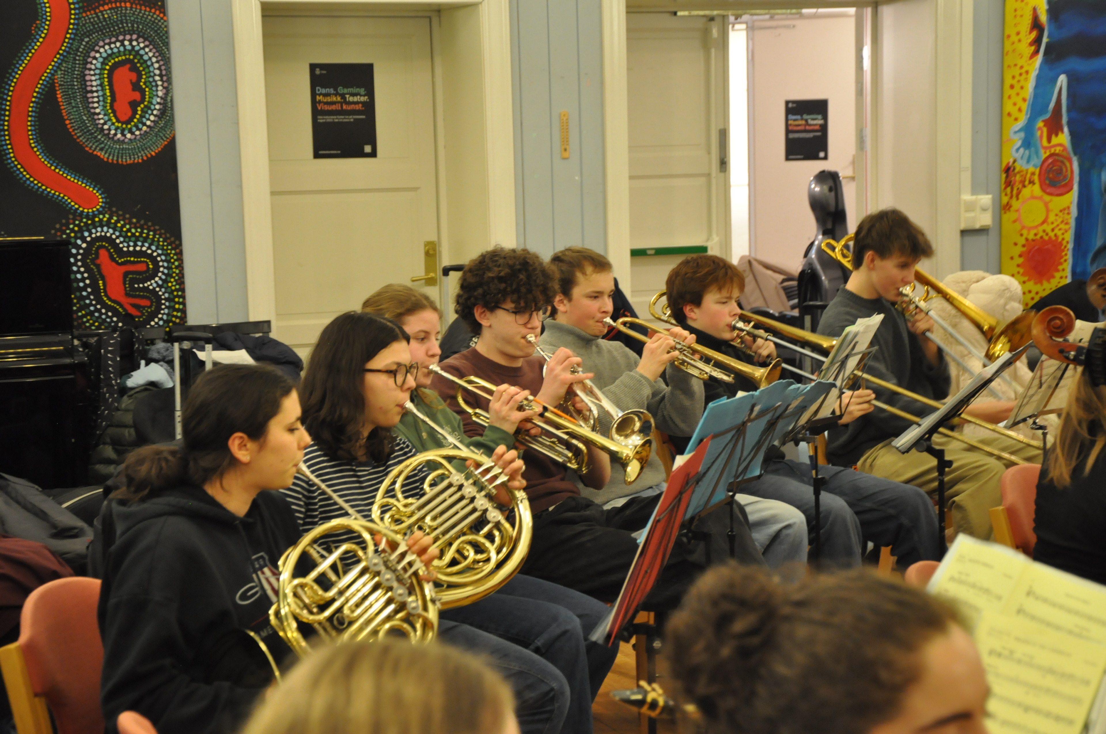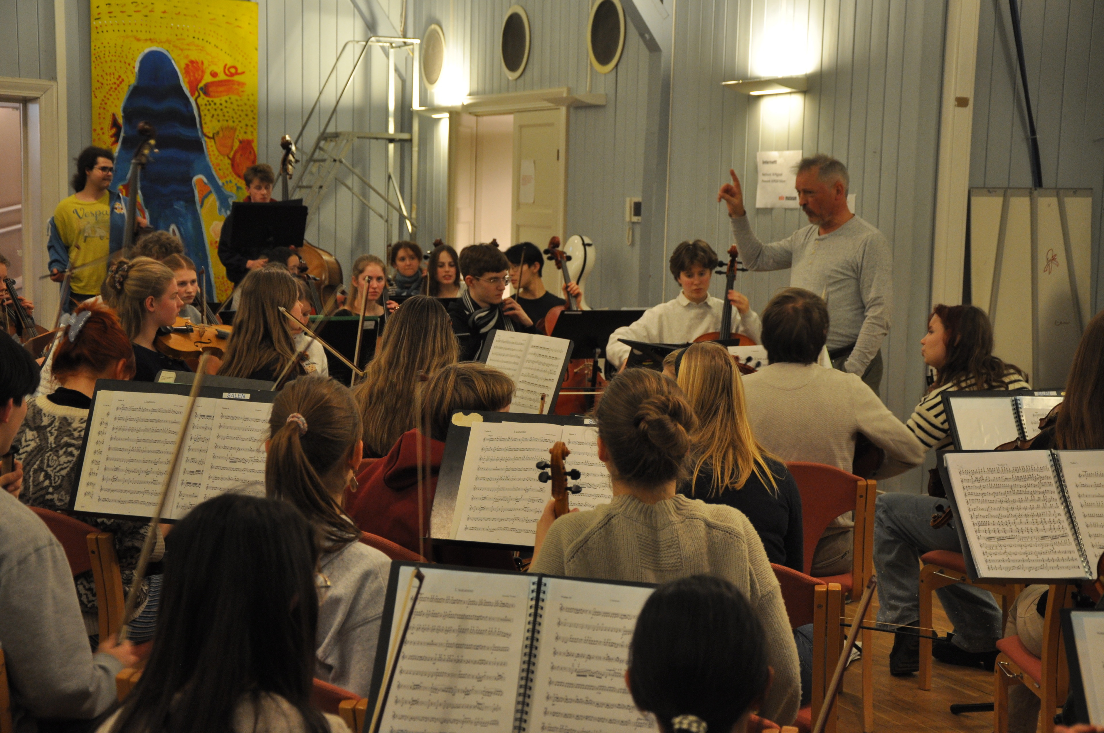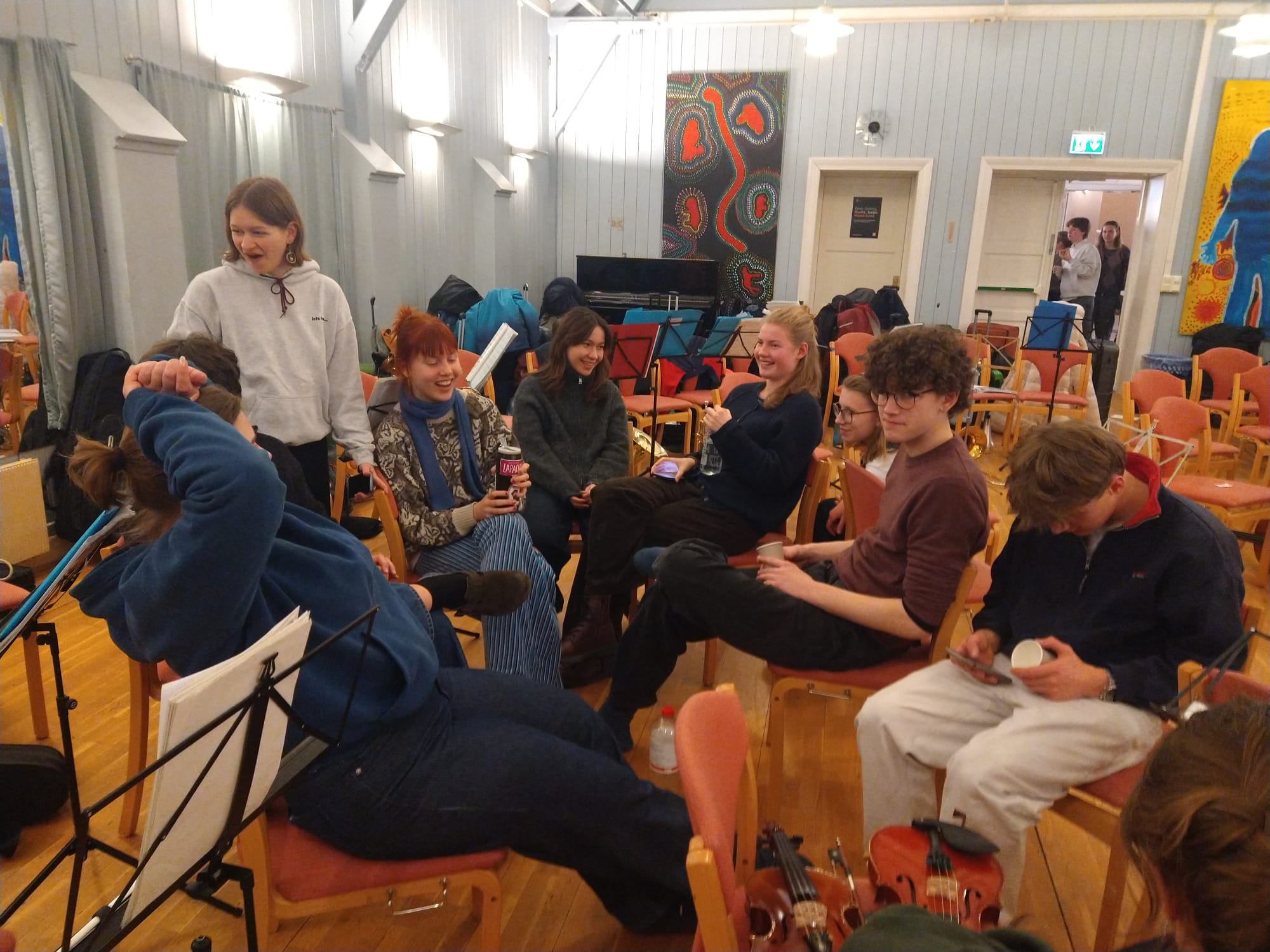 Eine sehr positive, aufgeräumte, fröhliche Atmosphäre entfaltet sich und einige unserer jugendlichen Partner aus Oslo sind auch schon da. Mit der Zeit werden es mehr und am Ende sitzen wir da mit einem stattlichen Sinfonieorchester: sicher 50 bis 60 Streicher, alle unsere Bläser, Bass, Gitarre, Schlagzeug …
