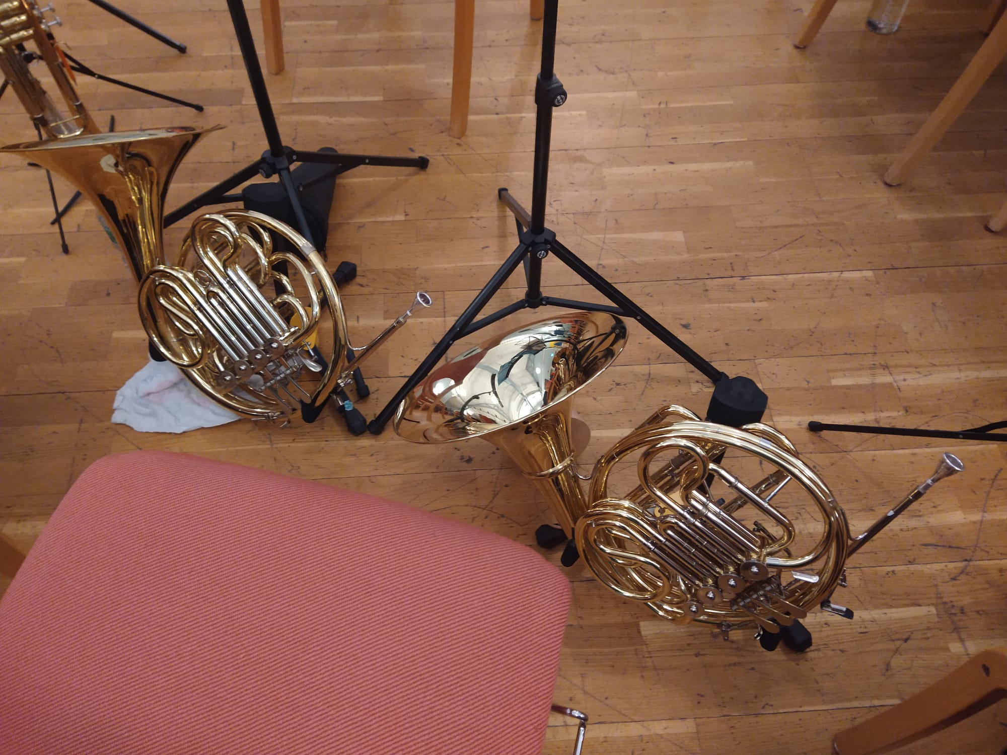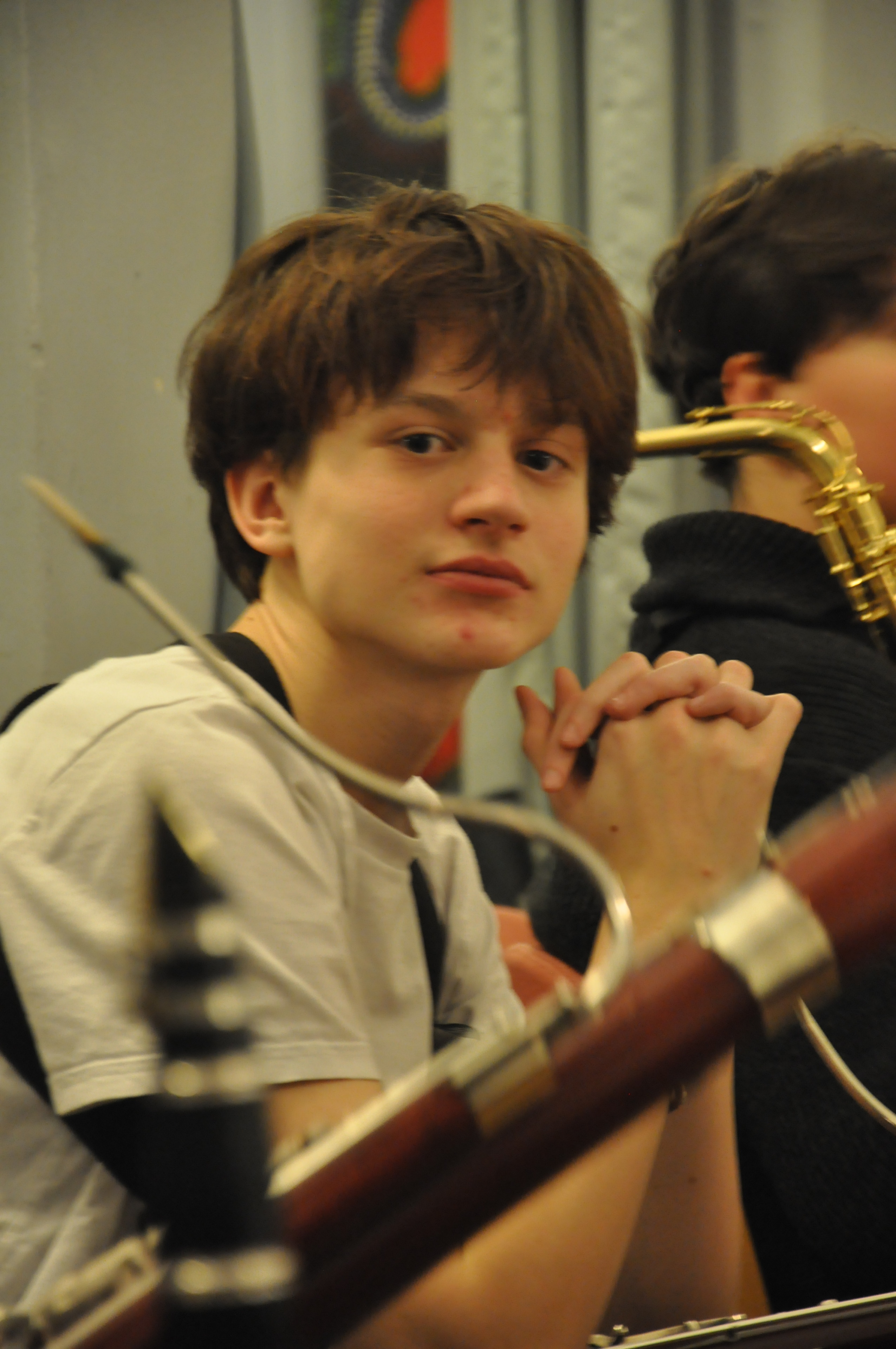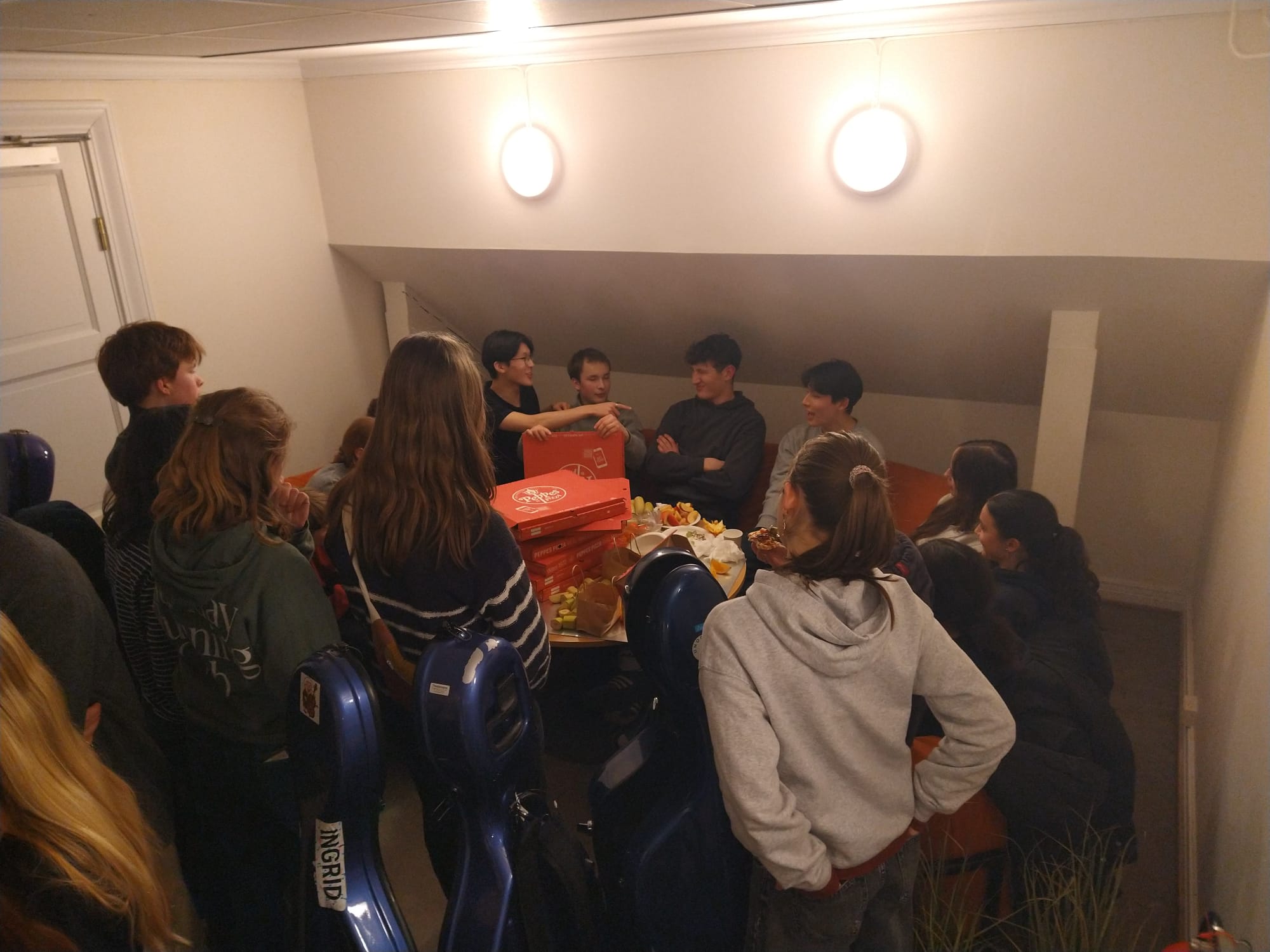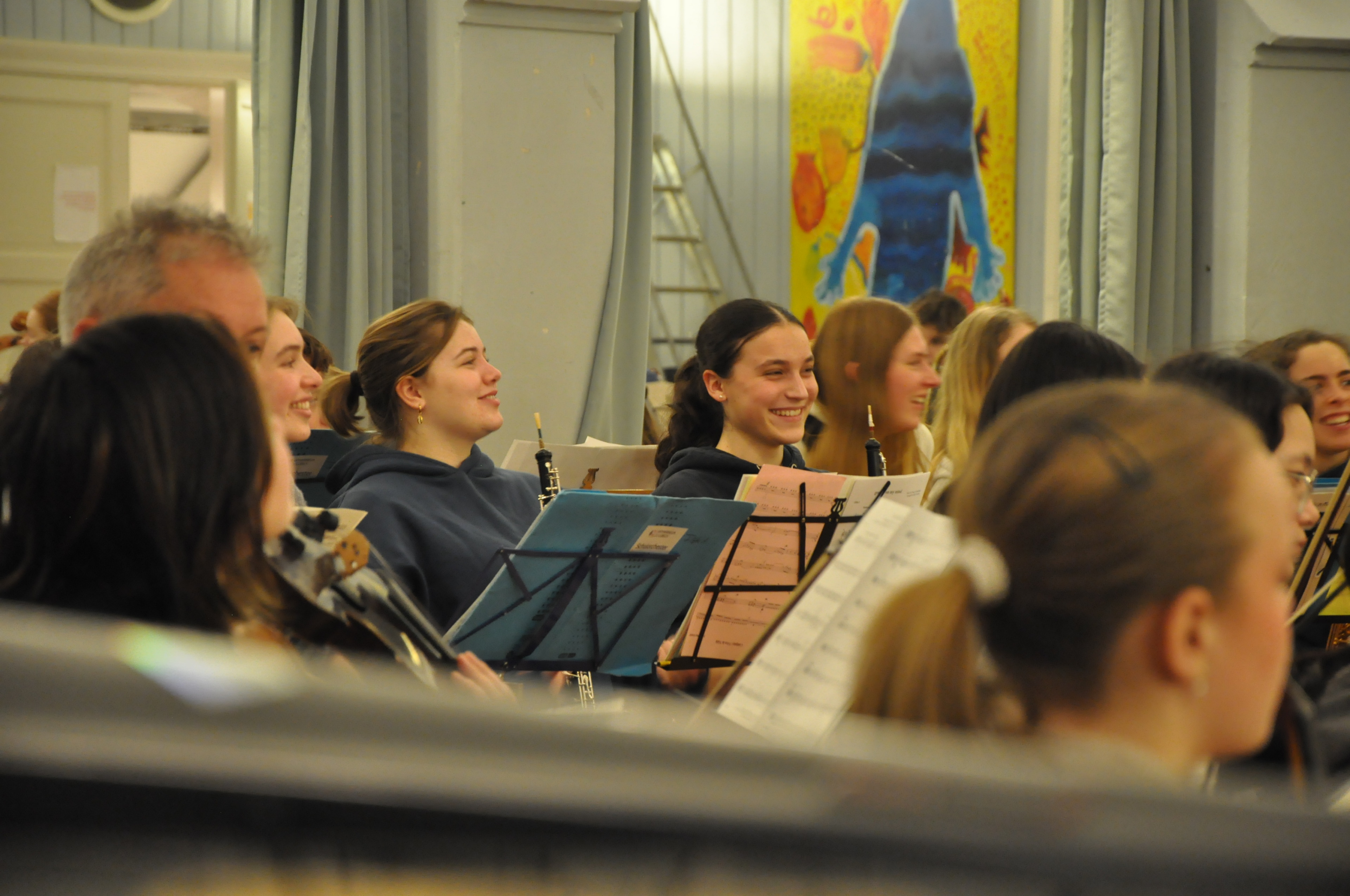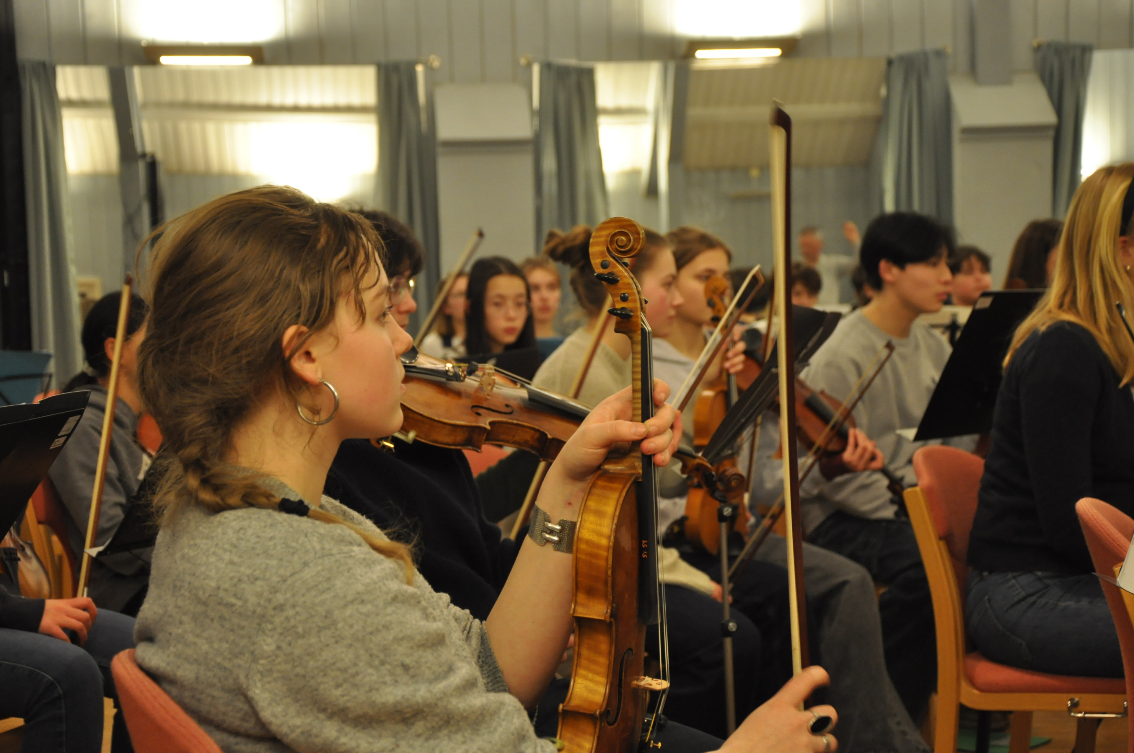 Eine sehr positive, aufgeräumte, fröhliche Atmosphäre entfaltet sich und einige unserer jugendlichen Partner aus Oslo sind auch schon da. Mit der Zeit werden es mehr und am Ende sitzen wir da mit einem stattlichen Sinfonieorchester: sicher 50 bis 60 Streicher, alle unsere Bläser, Bass, Gitarre, Schlagzeug …