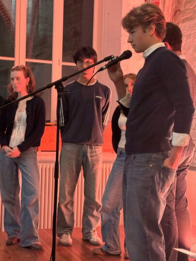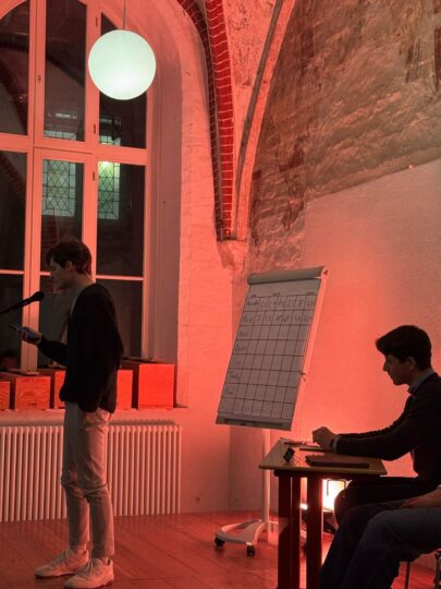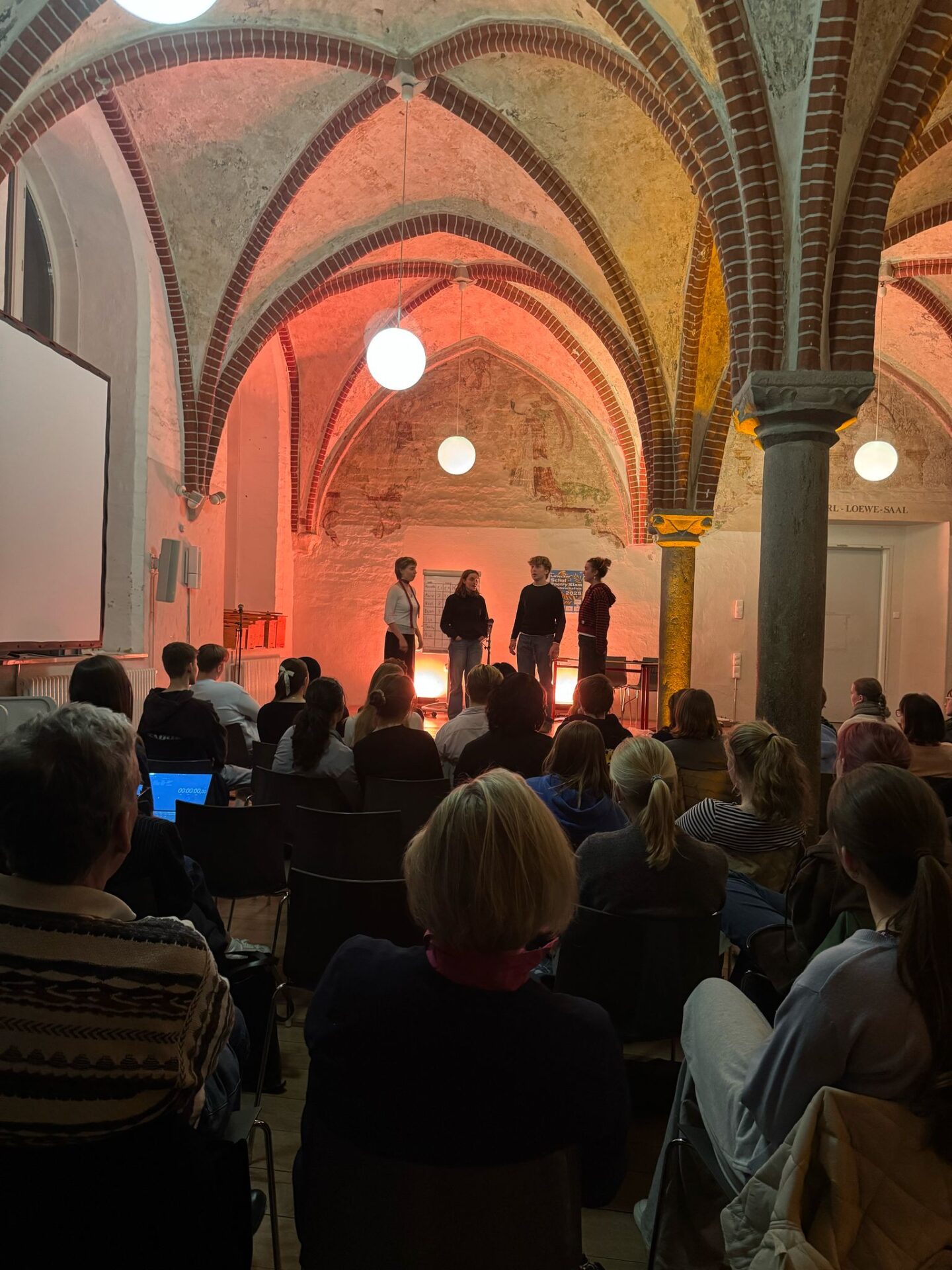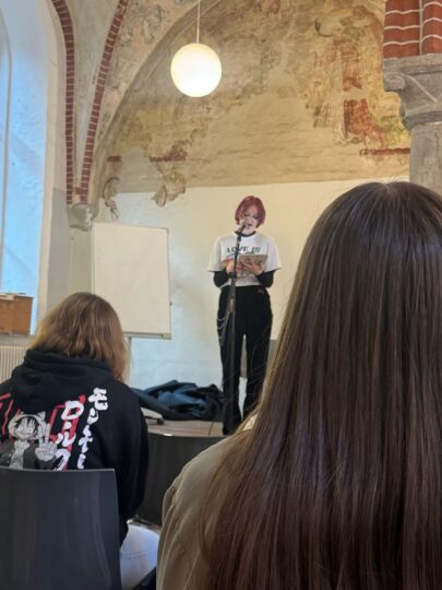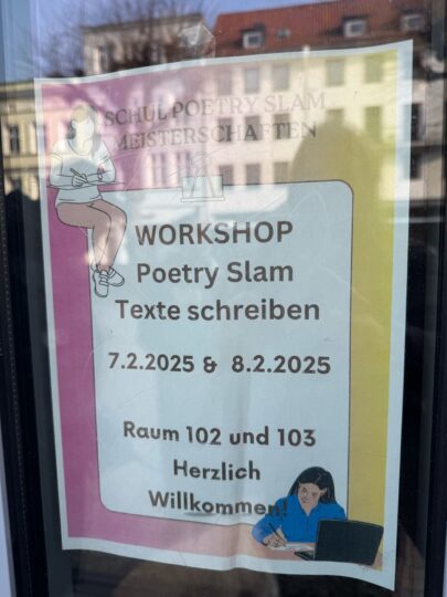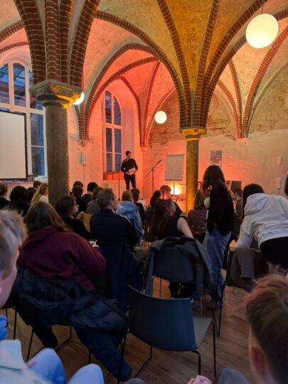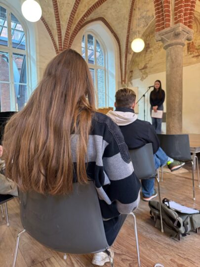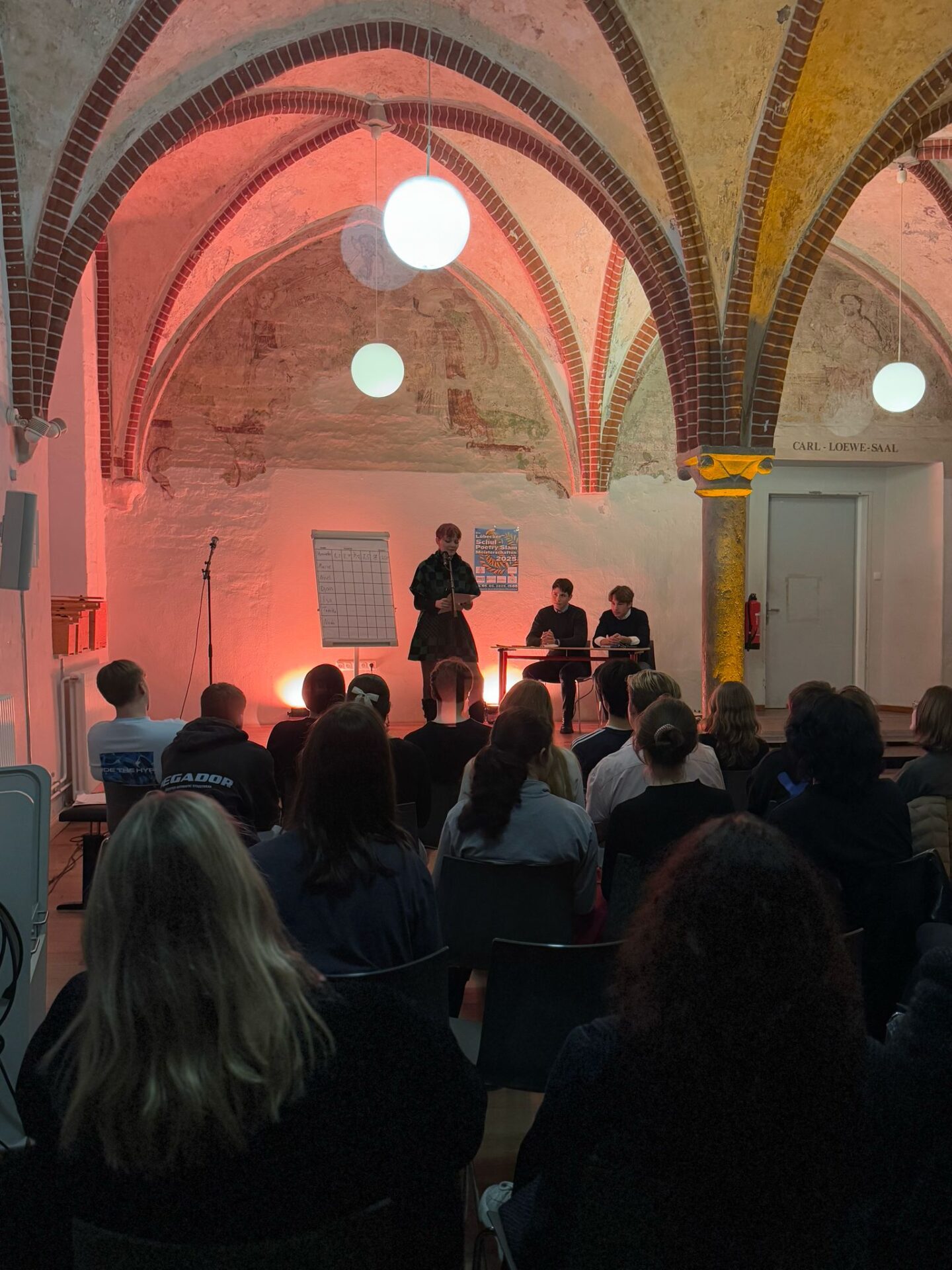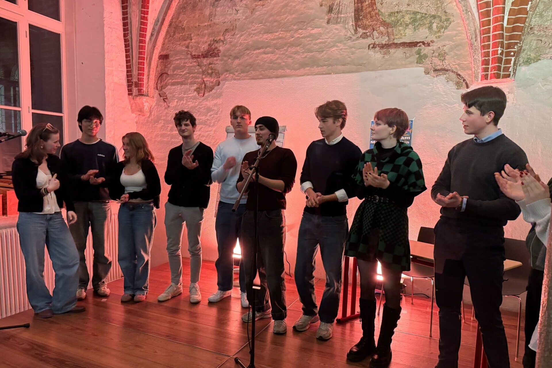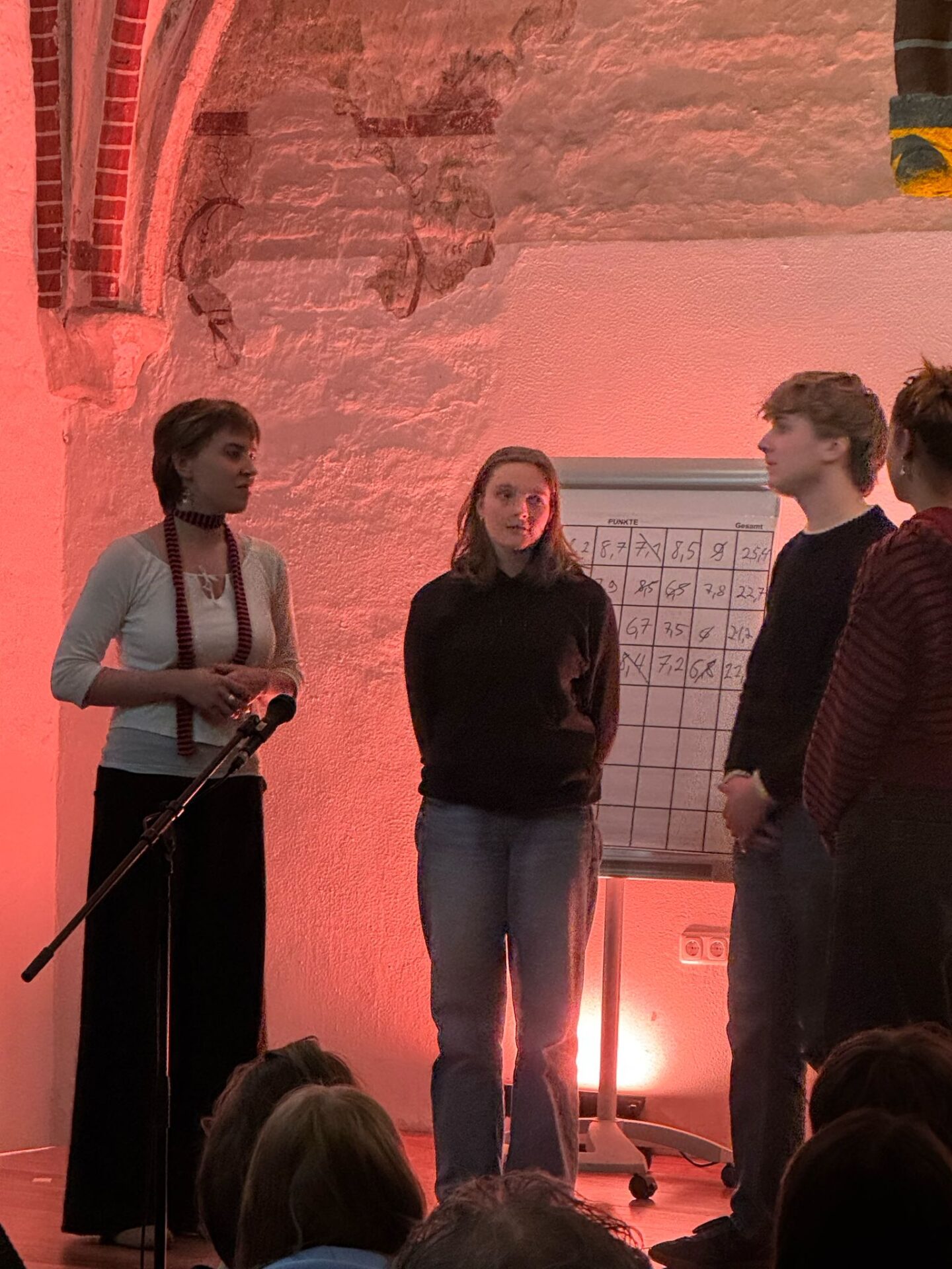 Beginnend mit dem Workshop-Wochenende angeleitet von zwei professionellen Poetry Slammern aus Hamburg am 7.2 und 8.2.2025 startete die Poetry-Slam-Saison 2025 am Katharineum. In entspannter Atmosphäre wurde mit Worten jongliert, Texte verfasst, wieder verworfen, vorgetragen und viel gelacht. Nun hatten 10 mutige Katharineerinnen Texte voller lustiger und auch dramatischer Geschichten, inspirierender Gedanken und eigener Gefühle.