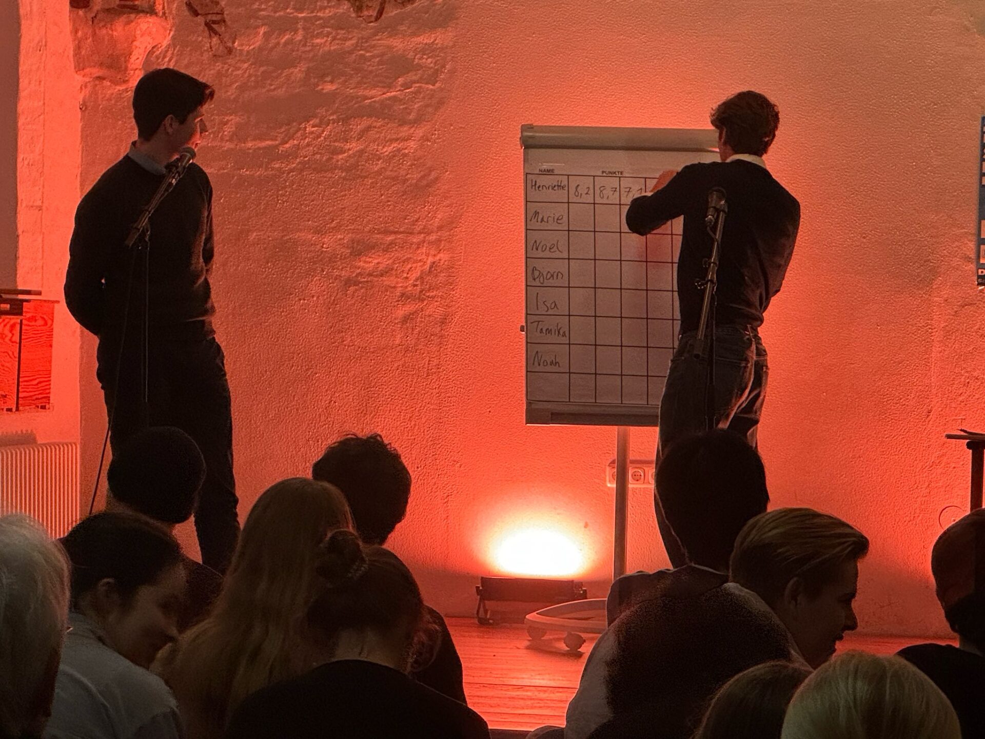 Auch das Publikum hatte großen Spaß, da es aktiv in das Geschehen einbezogen wurde. Zufällig ausgewählte Zuschauer:innen aus dem Publikum bildeten die Jury. Sie erhielten Karten mit Zahlen, mit denen sie die einzelnen Auftritte bewerten konnten. Nach jedem Vortrag vergaben sie individuelle Punktzahlen zwischen 1 und 10. Auch Kommazahlen waren erlaubt. Um eine faire Bewertung zu gewährleisten, wurden jeweils die höchste und die niedrigste Wertung gestrichen.