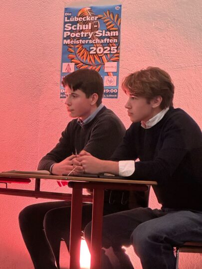 Am 20. März fand an unserer Schule dann der zweite Poetry-Slam-Abend statt. Wie schon im vergangenen Jahr wurde dieser Abend von Frau Bünger geplant und organisiert. Einige Slammerinnen und auch das legendäre Moderatoren-Team bestehend aus Yuki Merseburger und Peter Müller waren Wiederholungstäter:innen. Die Q2b in Personalunion von Linus Keck sorgte für Getränke und Naschitüten.