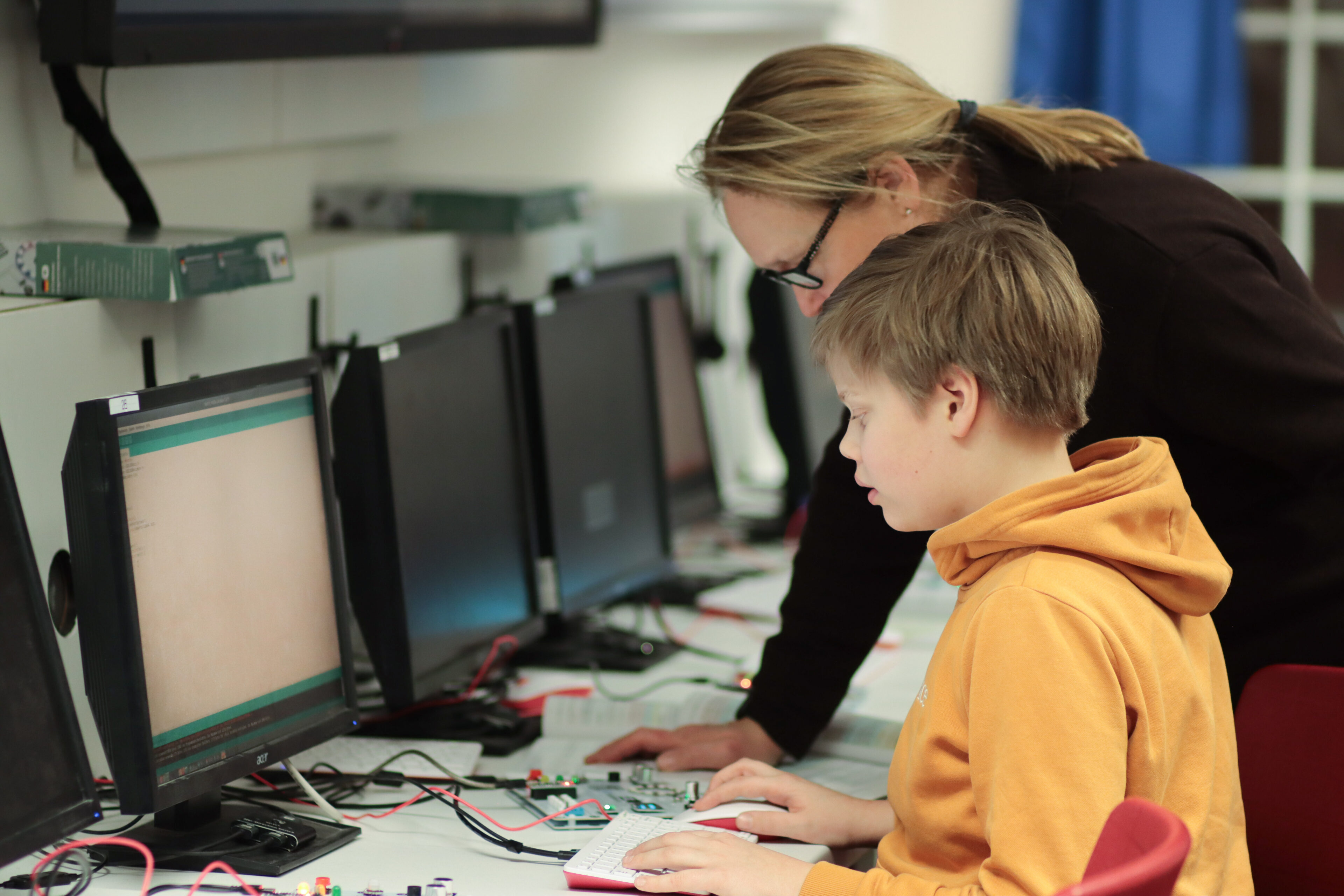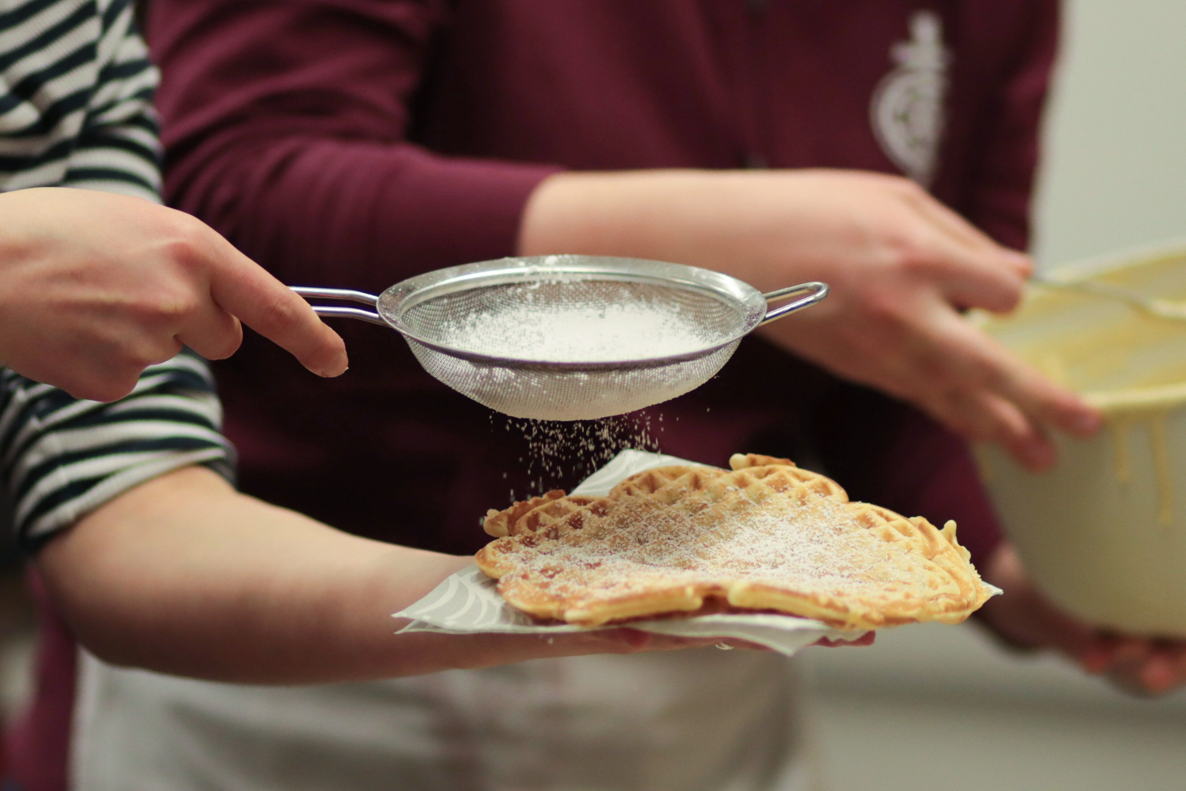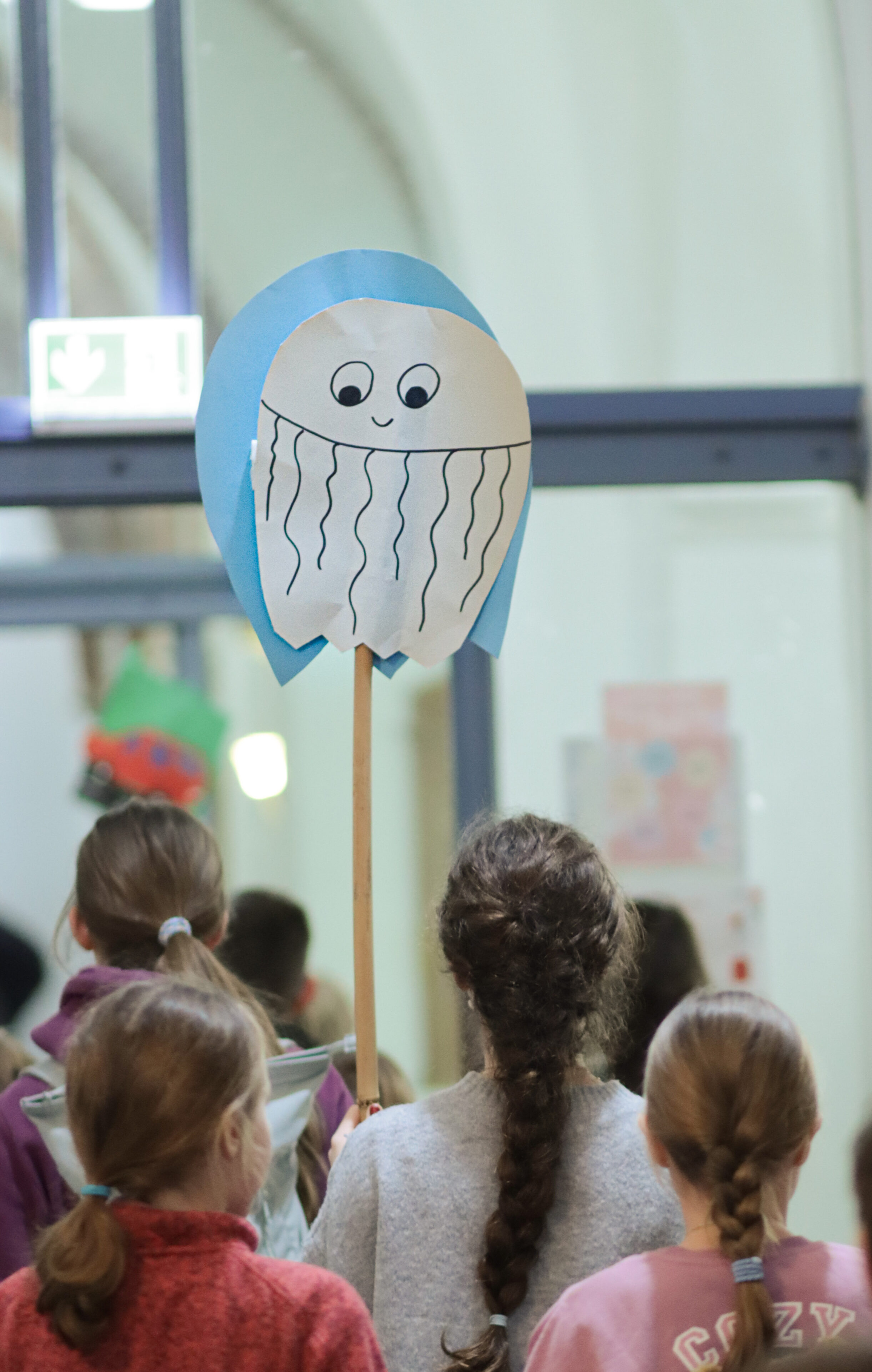 Im Anschluss erkundeten die Kinder selbst die Schule. In Gruppen, die an bunten Symbolen (Schaf, Elefant, Schneemann, Marienkäfer…) zu erkennen waren, wurden sie von Schüler:innen durch das Gebäude geführt und lernten verschiedene Räume, Fächer und AGs kennen. Ganz nach dem Schulmotto „TU ES“ durften sie ausprobieren, entdecken und mitgestalten. Währenddessen erhielten die Eltern bei separaten Führungen weitere Informationen. Für eine kurze Stärkung sorgte der Q1-Jahrgang, der mit frisch gebackenen Waffeln Spenden für den Abiball sammelte.
