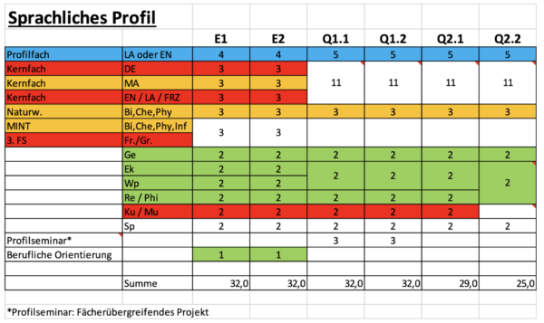 Die Profiloberstufe umfasst insgesamt drei Jahre und gliedert sich in die einjährige Einführungsphase E (11. Klasse) und die anschließende zweijährige Qualifikationsphase Q1 und Q2 (12. und 13. Klasse).