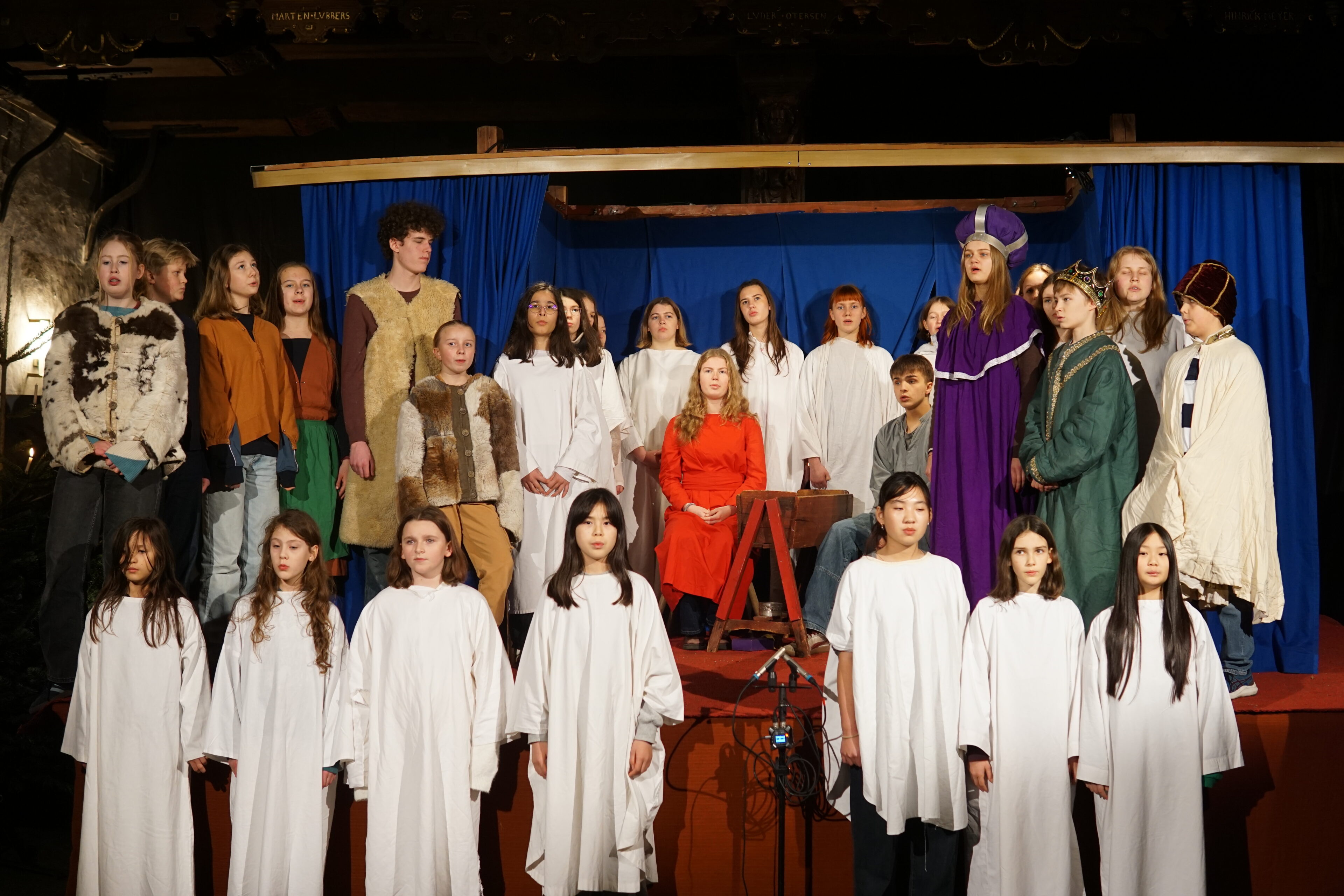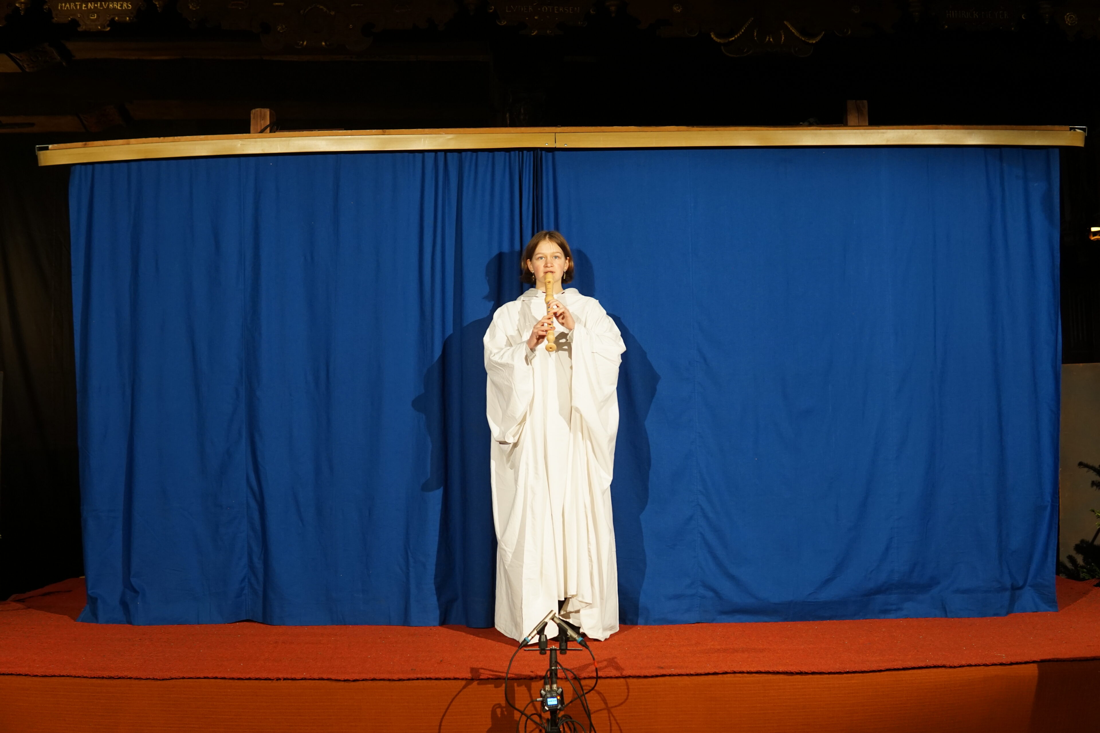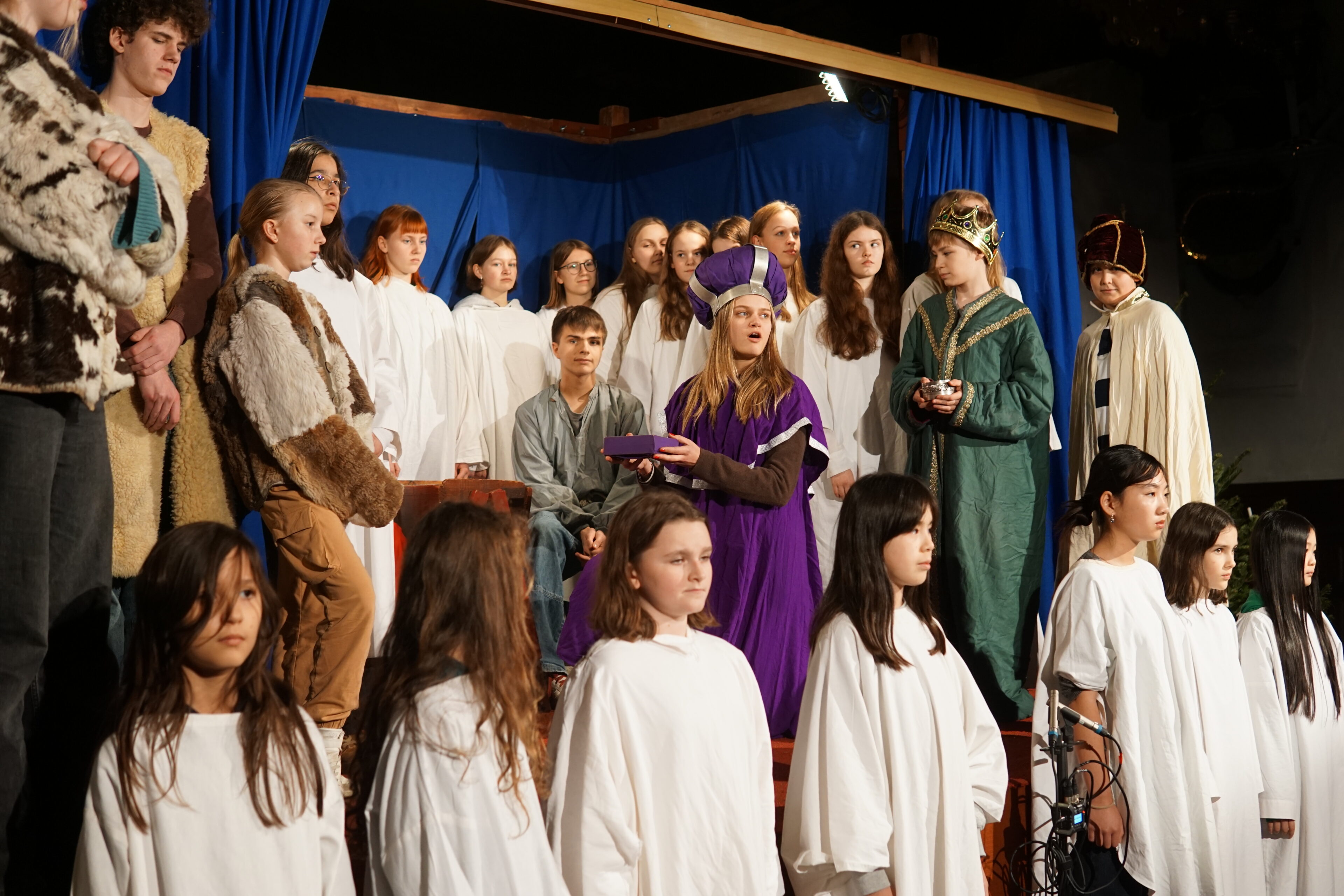 Auch die Kostüme trugen maßgeblich zur besonderen Atmosphäre bei: In ihrer Schlichtheit hoben sie sich vom blauen Bühnenhintergrund ab, sodass vor allem die Engel förmlich zu leuchten schienen. Jung und Alt, von Unterstufenschüler:innen bis zu Zwölftklässler:innen, kamen zusammen, probten gemeinsam und standen geschlossen auf der Bühne. Sie trugen Texte und Lieder vor – eine wunderschöne Tradition, die die Schulgemeinschaft stärkt und sowohl Publikum als auch Mitwirkende auf die kommenden Weihnachtstage einstimmte.