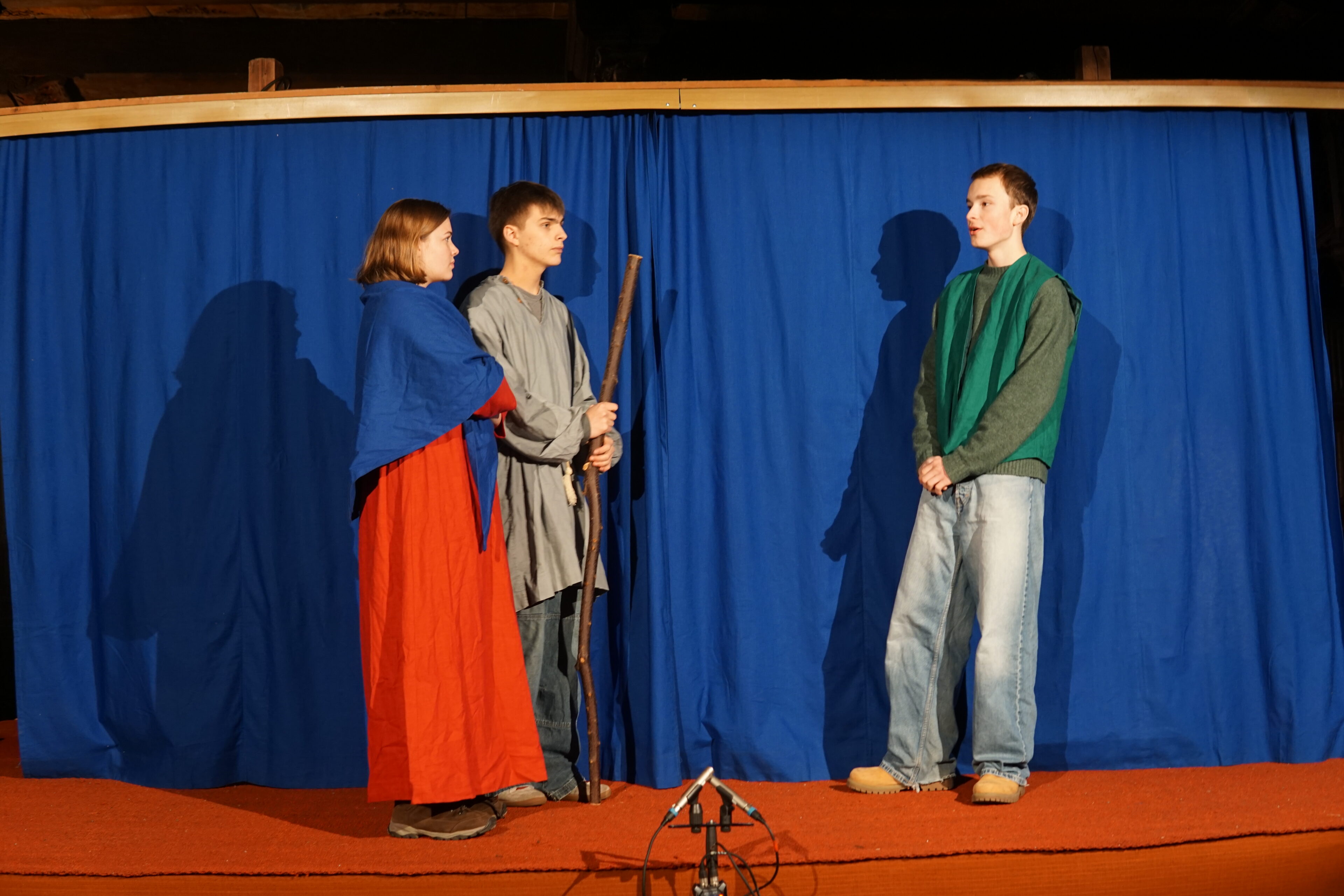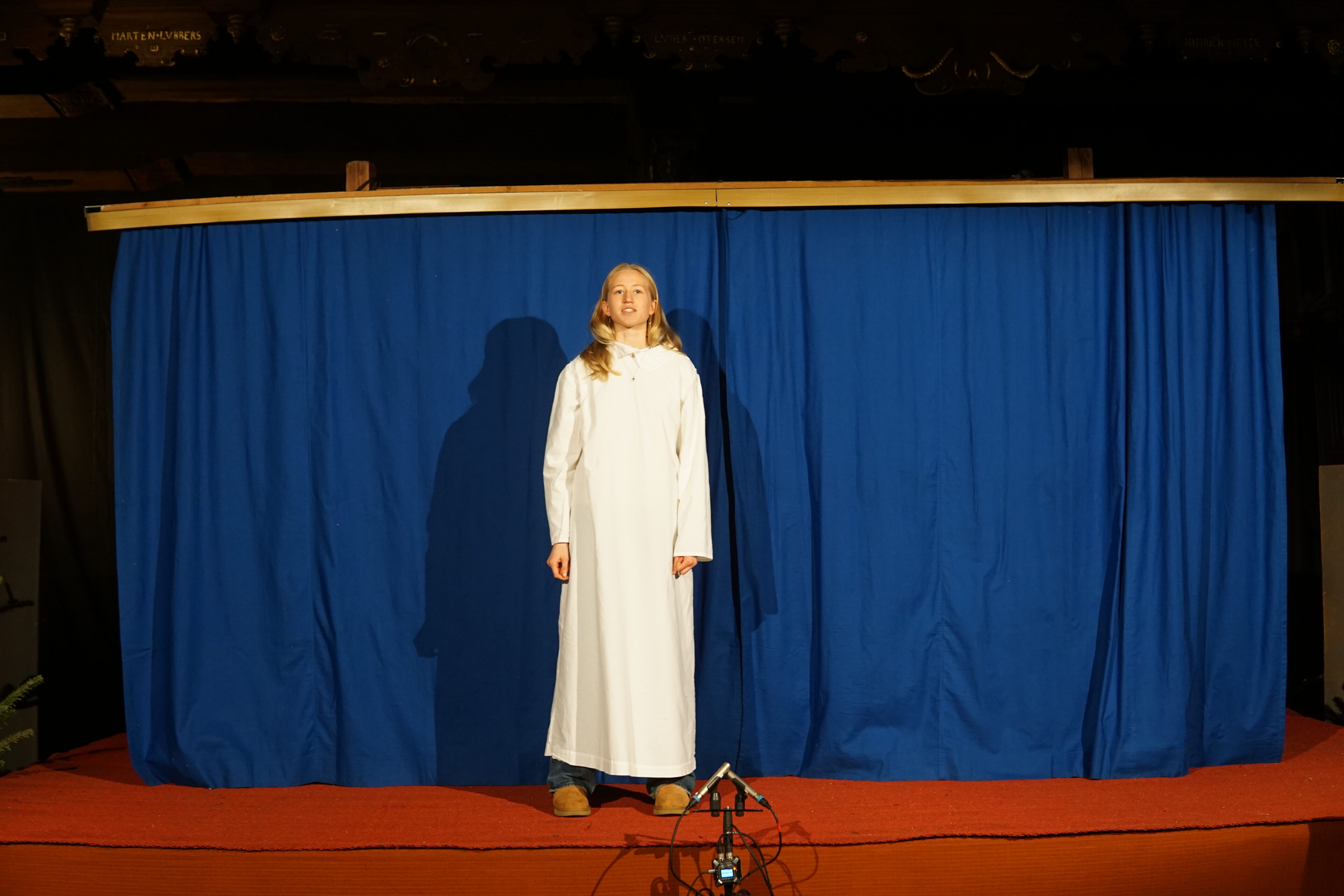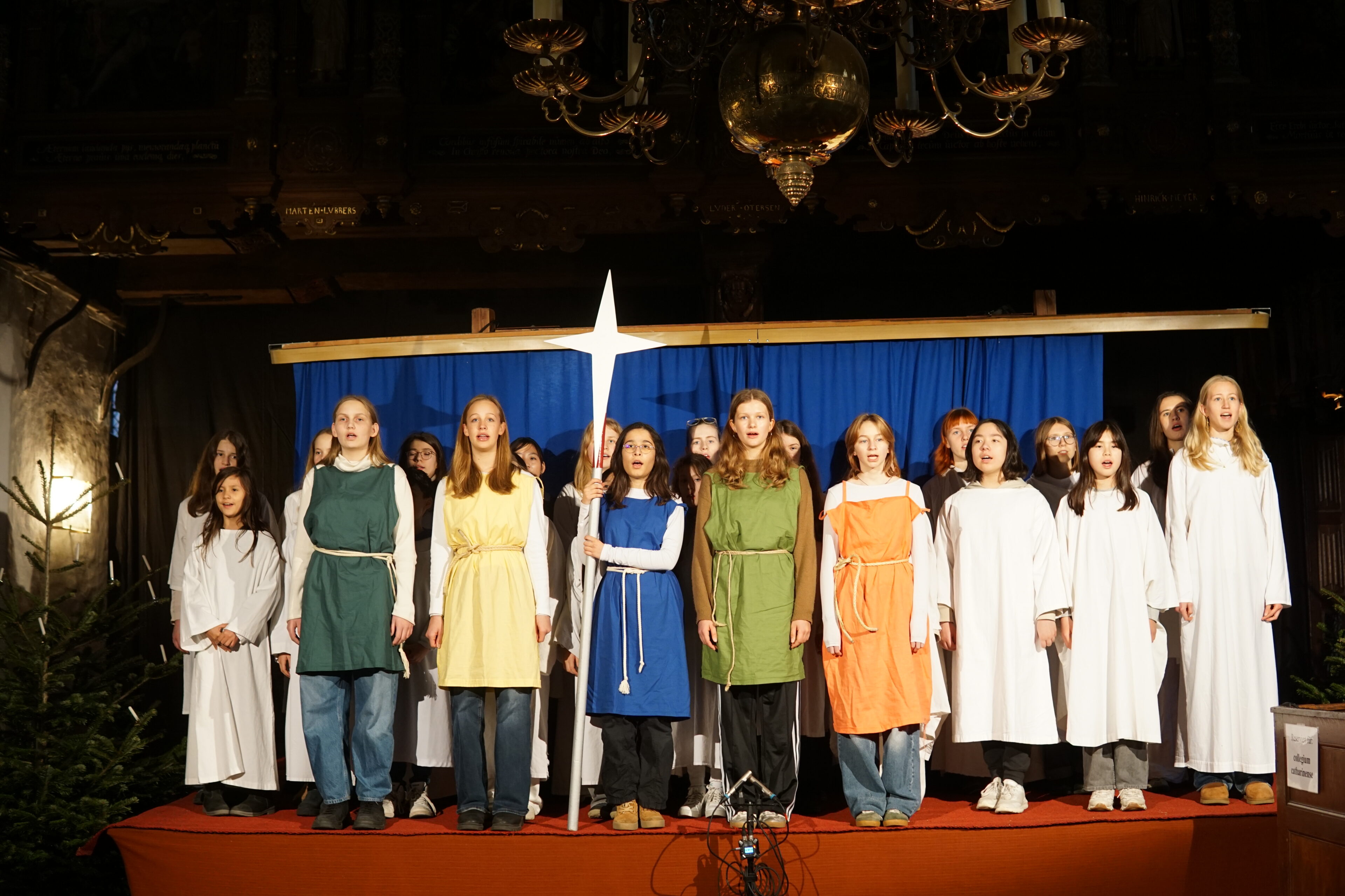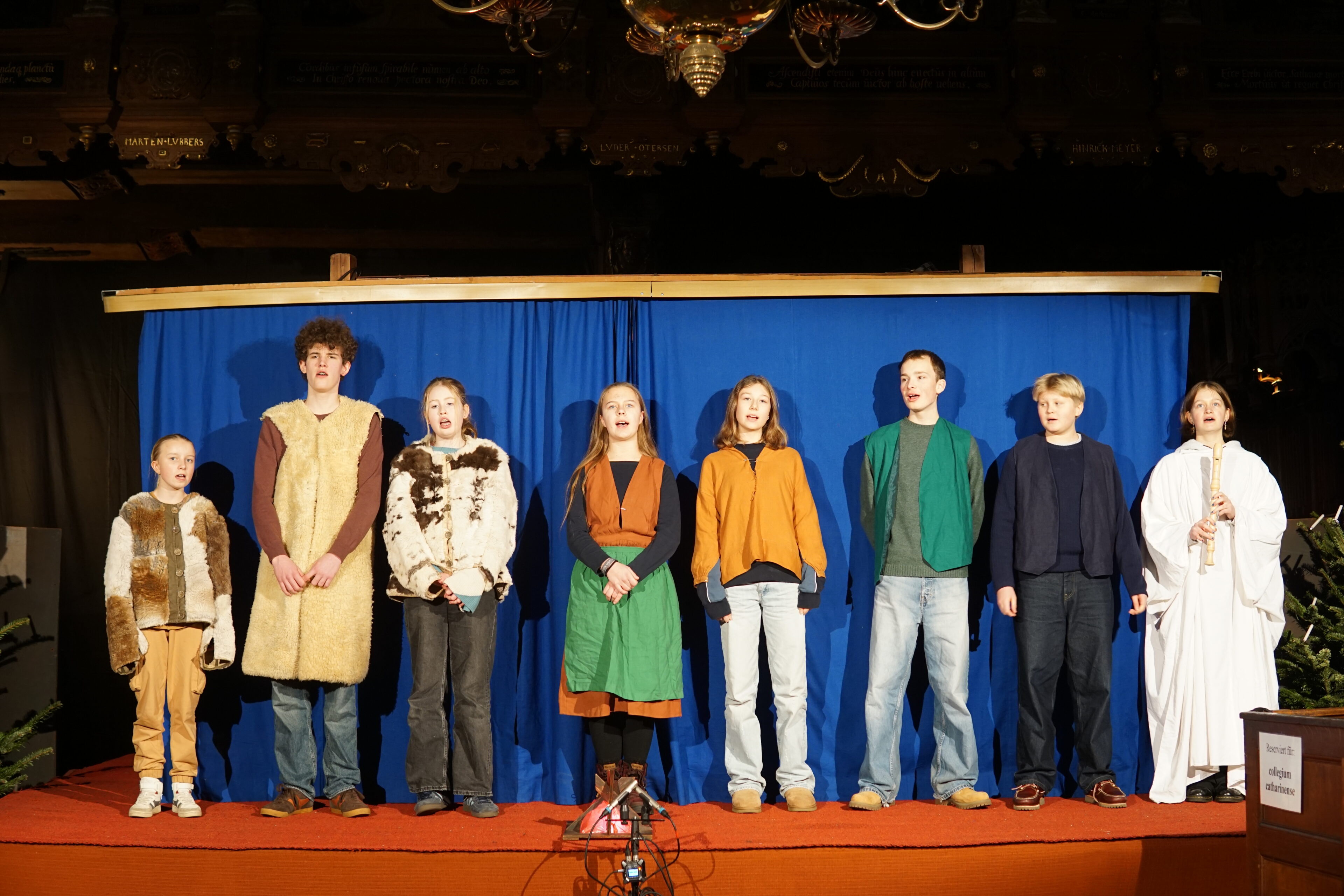 Auch die Kostüme trugen maßgeblich zur besonderen Atmosphäre bei: In ihrer Schlichtheit hoben sie sich vom blauen Bühnenhintergrund ab, sodass vor allem die Engel förmlich zu leuchten schienen. Jung und Alt, von Unterstufenschüler:innen bis zu Zwölftklässler:innen, kamen zusammen, probten gemeinsam und standen geschlossen auf der Bühne. Sie trugen Texte und Lieder vor – eine wunderschöne Tradition, die die Schulgemeinschaft stärkt und sowohl Publikum als auch Mitwirkende auf die kommenden Weihnachtstage einstimmte.