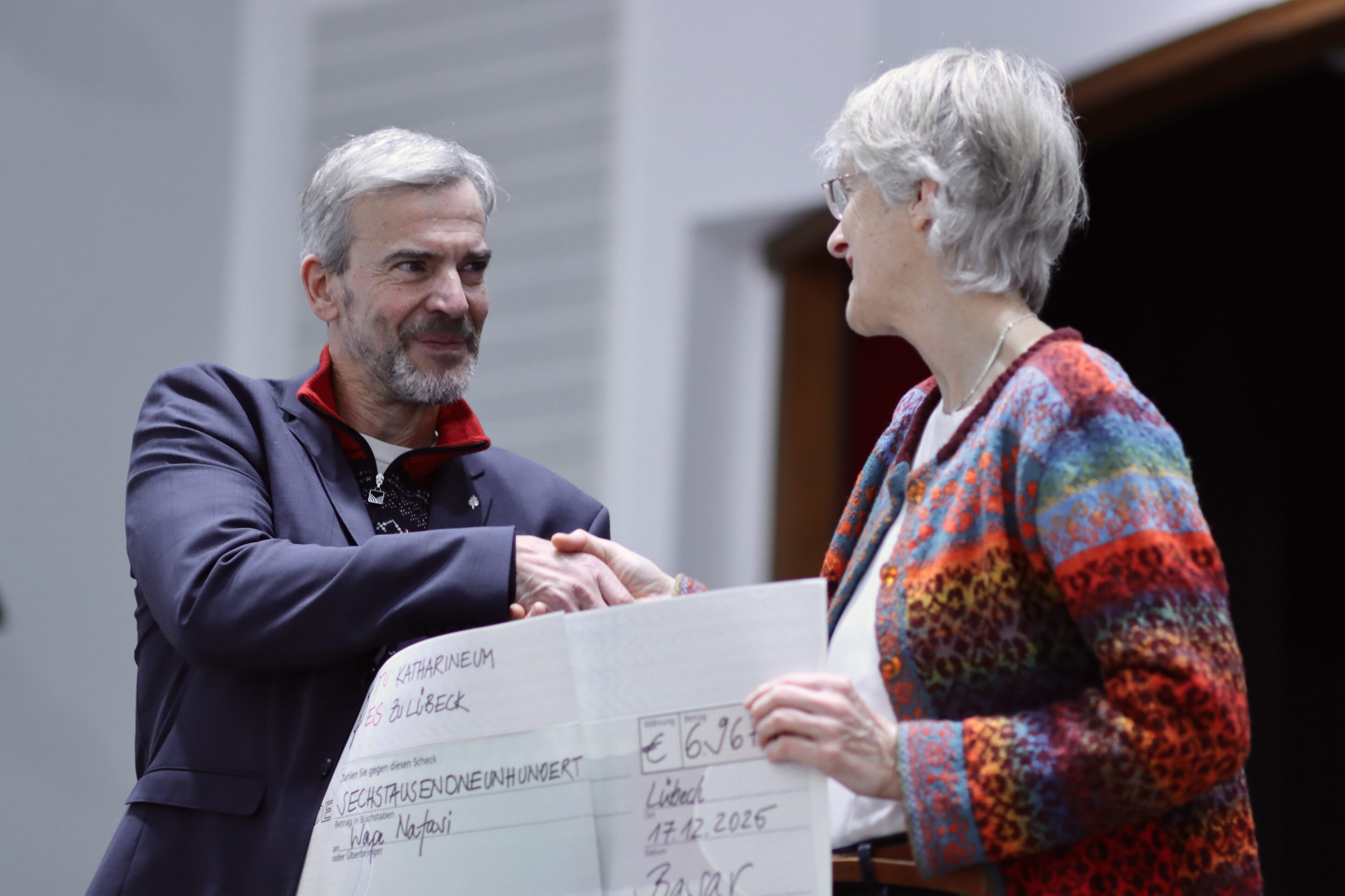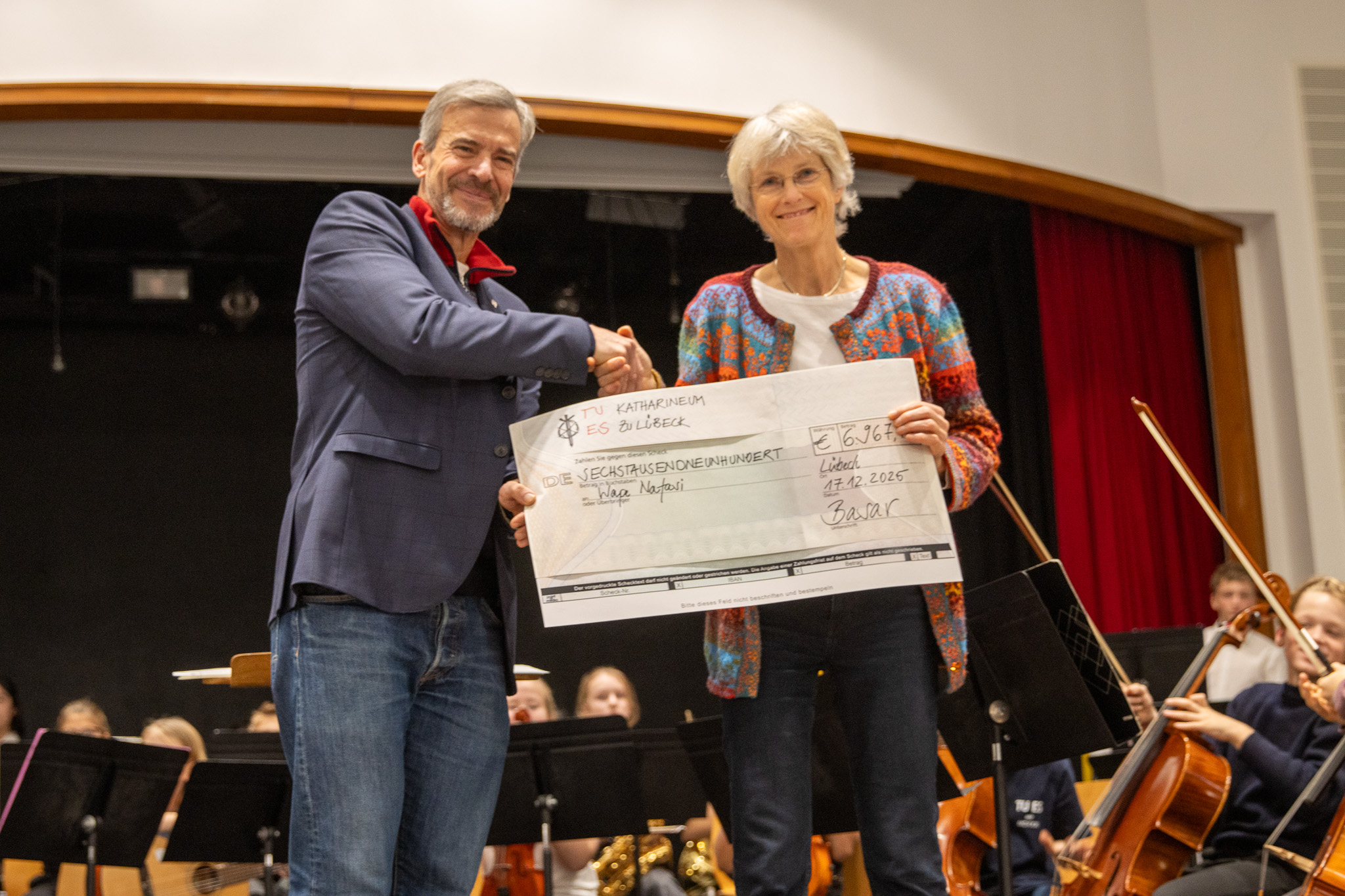 Das Adventskonzert bot jedoch nicht nur Raum für musikalische Darbietungen, sondern auch für einen weiteren wichtigen Anlass: die Übergabe des Erlöses des Katharinabasars, der am 21. November stattgefunden hatte. Der gesammelte Betrag wurde an die Initiative Wape Nafasi gespendet, die eine Partnerschule in Kenia unterstützt. In diesem Jahr sammelten wir fleißig für neue Bücher, Möbel und den Ausbau des Schulgebäudes. Wie Herr Schrader in seiner Rede stolz verkündete, kam dabei ein Rekordbetrag zusammen, der größtenteils der neuen 3D-Druck-AG zu verdanken sei, die während des Basars Weihnachtsbaumkugeln aus dem 3D-Drucker verkaufte. An dieser Stelle gilt unser herzlicher Dank allen großzügigen Eltern, Verwandten und Freunden, die mit ihrem Einkauf und ihren Spenden maßgeblich zu diesem Erfolg beigetragen haben.
